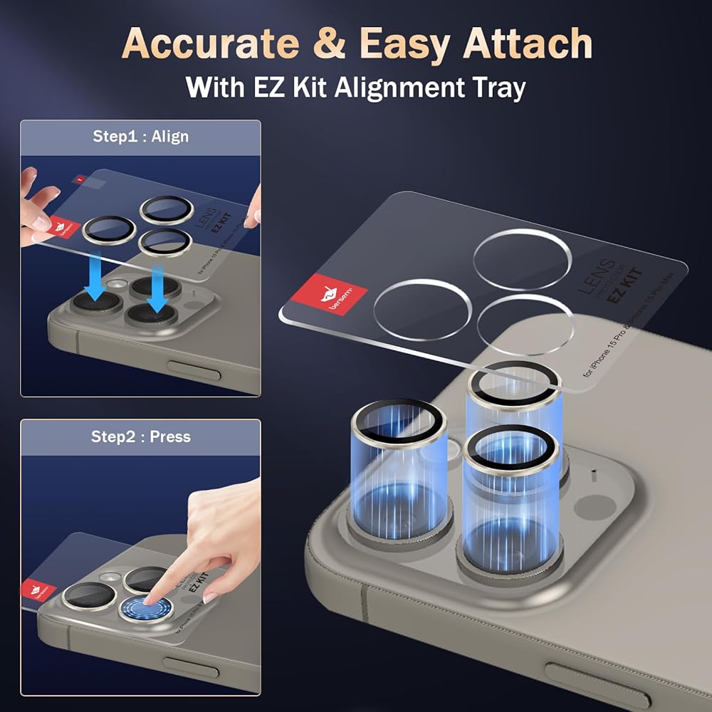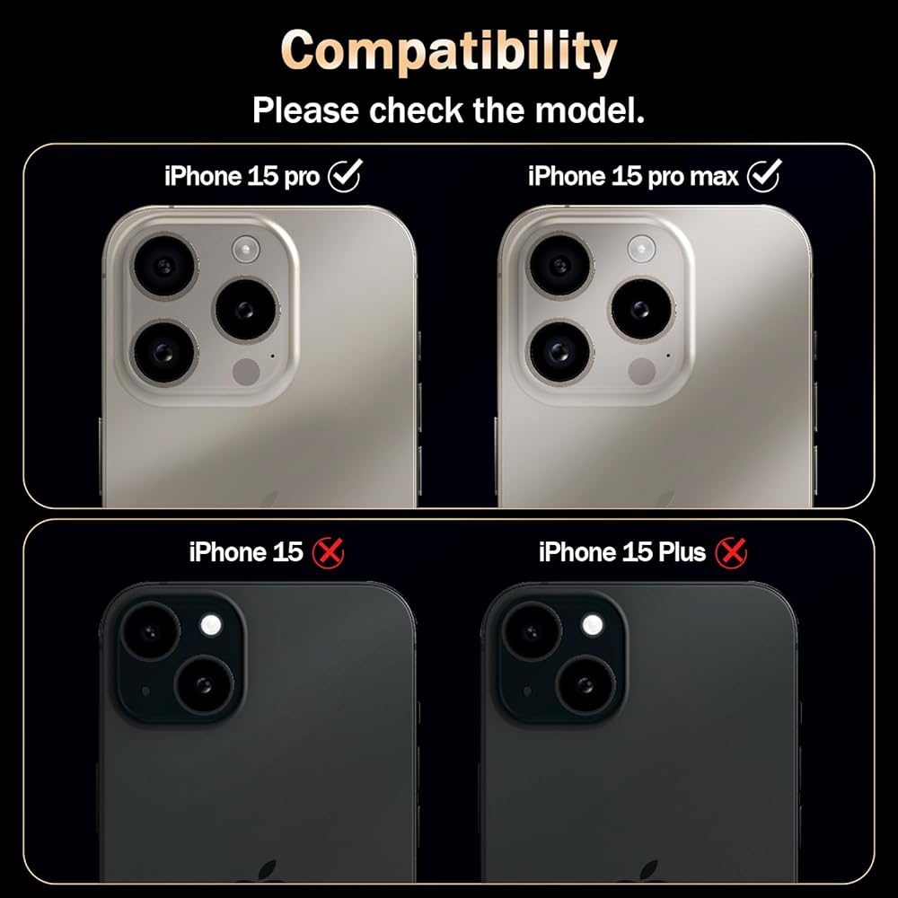 التوافق: مصمم خصيصًا لهاتف iPhone 15 pro max (6.7 بوصة) / iPhone 15 Pro (6.1 بوصة). يرجى التحقق من طراز هاتفك قبل الشراء. ما يتضمن: قطعتان من واقيات عدسة الكاميرا (ذهبية) مع صينية EZ Kit، 2 × مجموعة تنظيف
