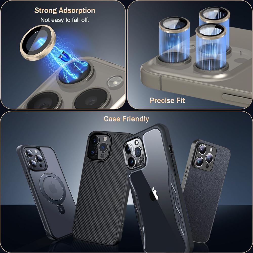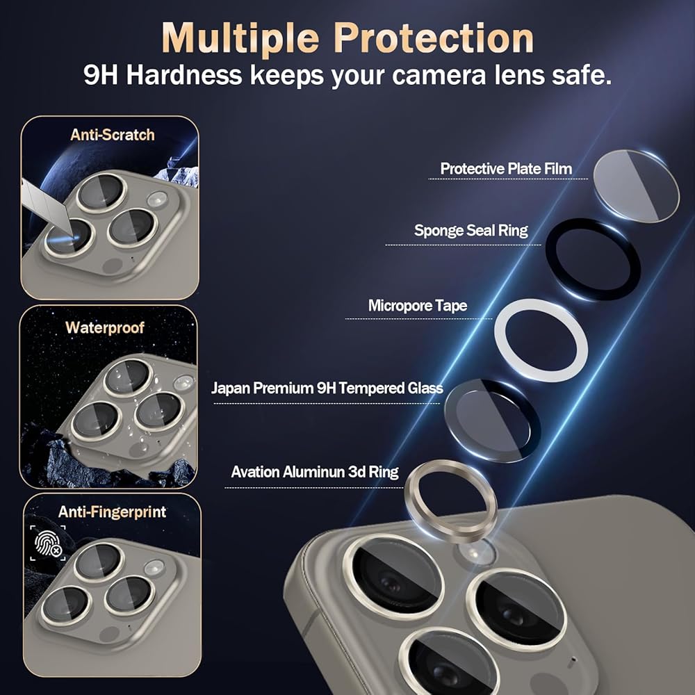 حماية مثالية: زجاج مقسى عالي الجودة 9H مع حلقة من سبائك الألومنيوم ثلاثية الأبعاد يوفر مصدًا مرتفعًا حول العدسة لتعزيز الحماية التي يمكنها حماية عدسة الكاميرا iPhone 15 pro / 15 pro max بشكل فعال من الخدوش غير الضرورية والصدمات تحت تأثير شديد