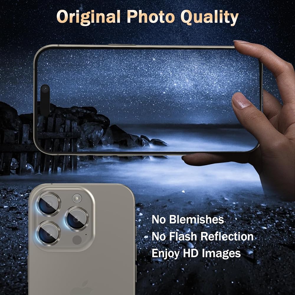 Ultra HD: يساعد غطاء عدسة الكاميرا iPhone 15 pro / 15 pro max الرفيع للغاية مع نفاذية عالية بنسبة 99.99% على تقليل الوهج دون عيوب، والحفاظ على جودة الصورة الأصلية حتى عند استخدام الفلاش في الليل. يقلل الطلاء الكاره للماء والزيوت الموجود على السطح من بصمات الأصابع واللطخات للحفاظ على نظافة عدساتك دائمًا