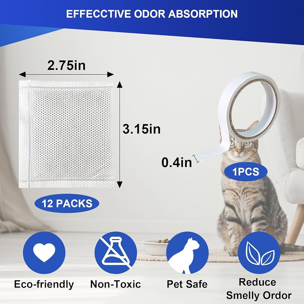• تشمل العبوة: سوف تحصل على 12 عبوة محكمة الغلق من مزيل رائحة فضلات القطط ولفة من الشريط ذي الوجهين الذي يمكن أن يقلل من الرائحة بشكل أفضل ويحصل على هواء منعش. لضمان إزالة الروائح الكريهة بشكل مثالي، يرجى استبدال العبوات كل 2 إلى 3 أسابيع.