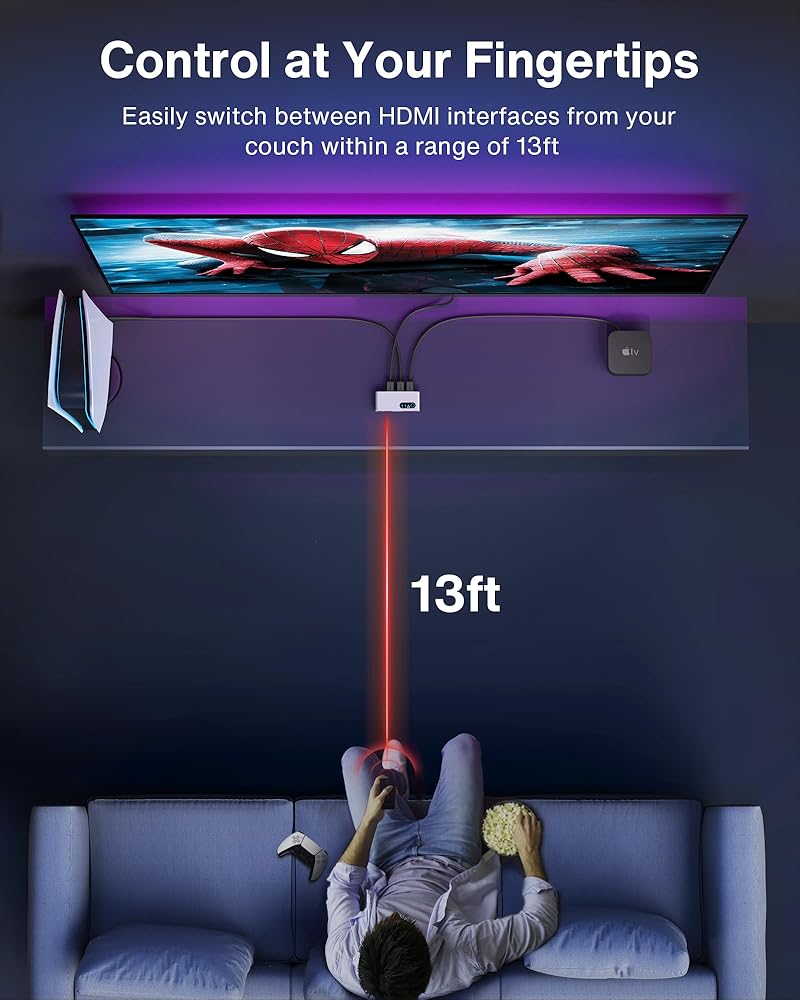【 تحكم فوري مع جهاز تحكم عن بعد بالأشعة تحت الحمراء 】 قم بالتبديل بسهولة بين مصادر HDMI الخاصة بك من مسافة تصل إلى 13 قدمًا، مع أوقات تبديل تتراوح من 1-2 ثانية. (ملاحظة: قم بتوجيه جهاز التحكم عن بعد إلى جهاز استقبال الأشعة تحت الحمراء لتبديل المصدر.)