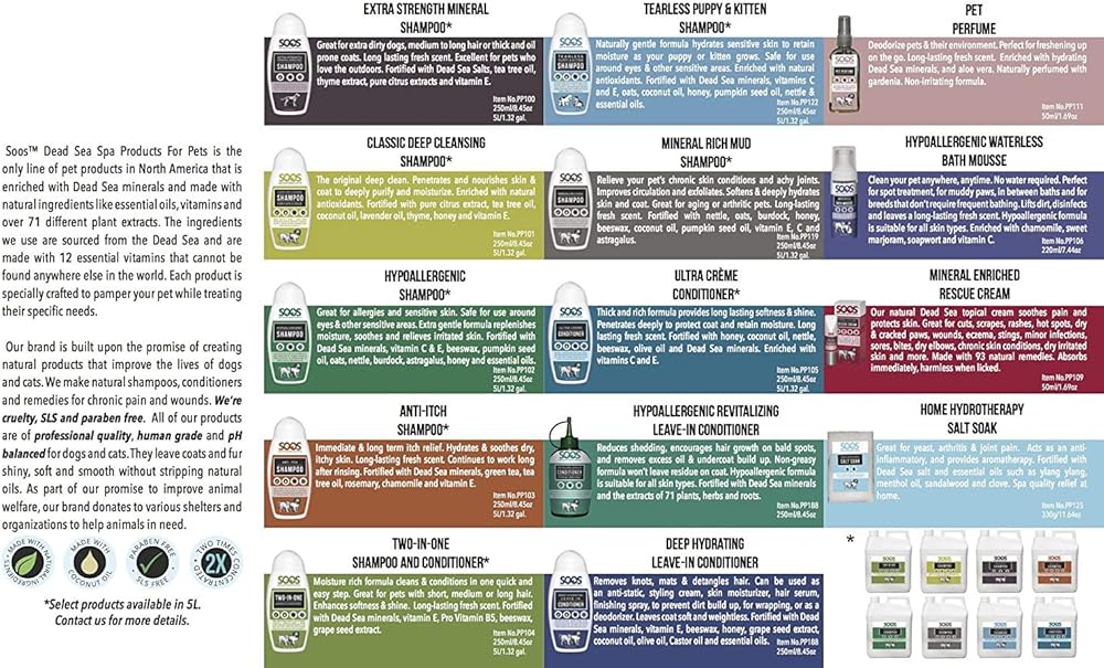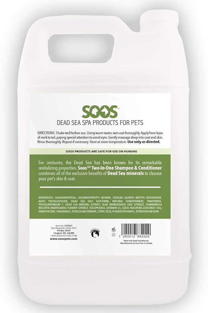 شامبو وبلسم Soos Pet بمعادن البحر الميت الطبيعية اثنين في واحد يمتص بعمق مع الفيتامينات والزيوت الأساسية والمكونات الطبيعية المضادة للبكتيريا للكلاب والقطط (4 لتر)