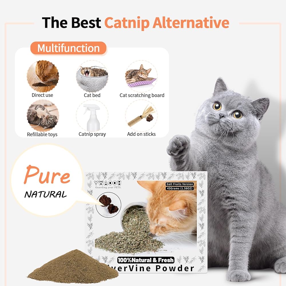 قوة النعناع البري: قل وداعًا للعب العادي! مسحوق الكرمة الفضية الخاص بنا هو بديل قوي للنعناع البري، حيث يوفر مستوى أعلى من التحفيز الذي يحول حتى القطط الأكثر كسلاً إلى صيادين مرحين.