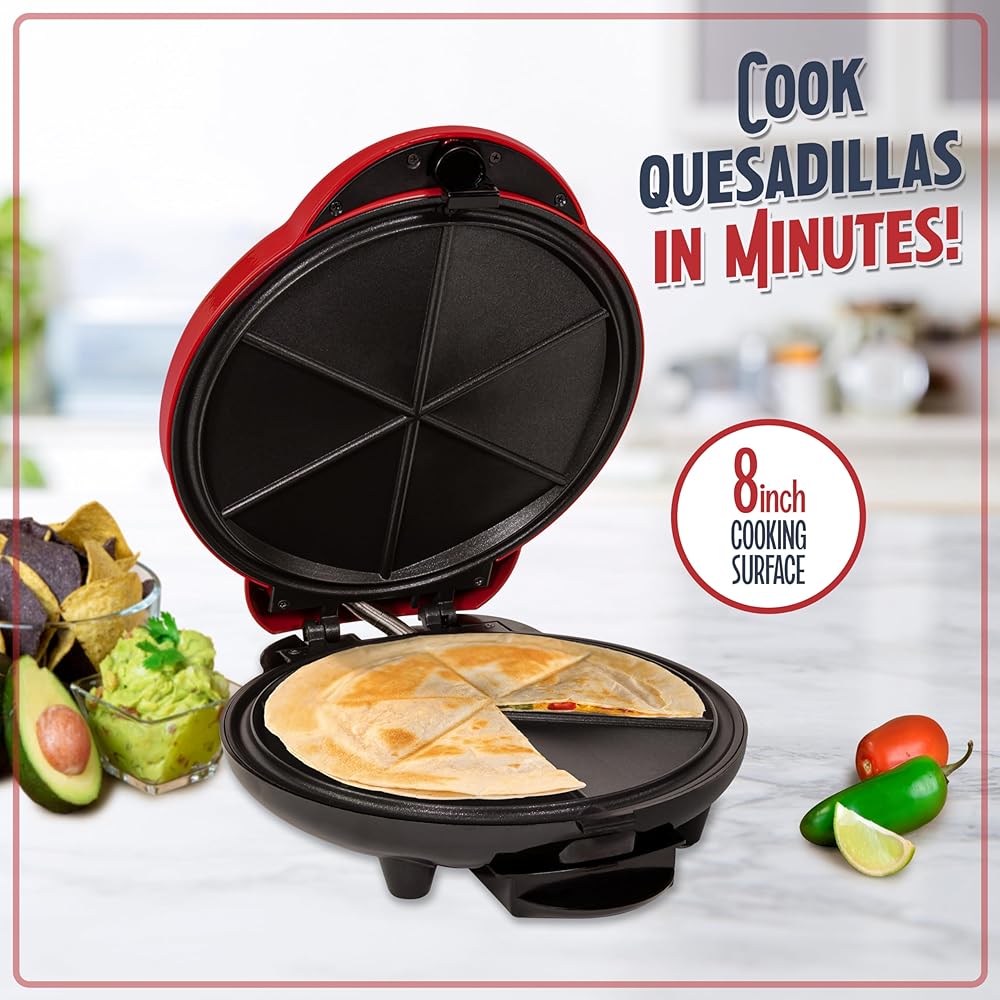 Bring the fiesta right into the kitchen and create crispy and delicious quesadillas quickly. The extra stuffing latch allows for more filling and the plate design creates 6 wedges that seal in the flavor. With the non-stick surface and drip tray cleanup is simple. Cooks quesadilla in just minutes.