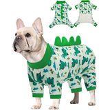 Dress your dog in CuteBone Dinosaur Pajamas, made from spandex crystal velvet for a soft and stretchy fit. These cozy pjs keep your pet comfortable during chilly days and nights, providing warmth without restricting movement. The vibrant dinosaur print adds a playful touch, while the one-piece pullover design makes dressing quick and easy. Whether for lounging, sleeping, or playing, these pajamas offer added comfort and style. Ideal for small dogs, they also protect your pet's fur and skin from dirt and irritation, making them practical for indoor and outdoor wear.