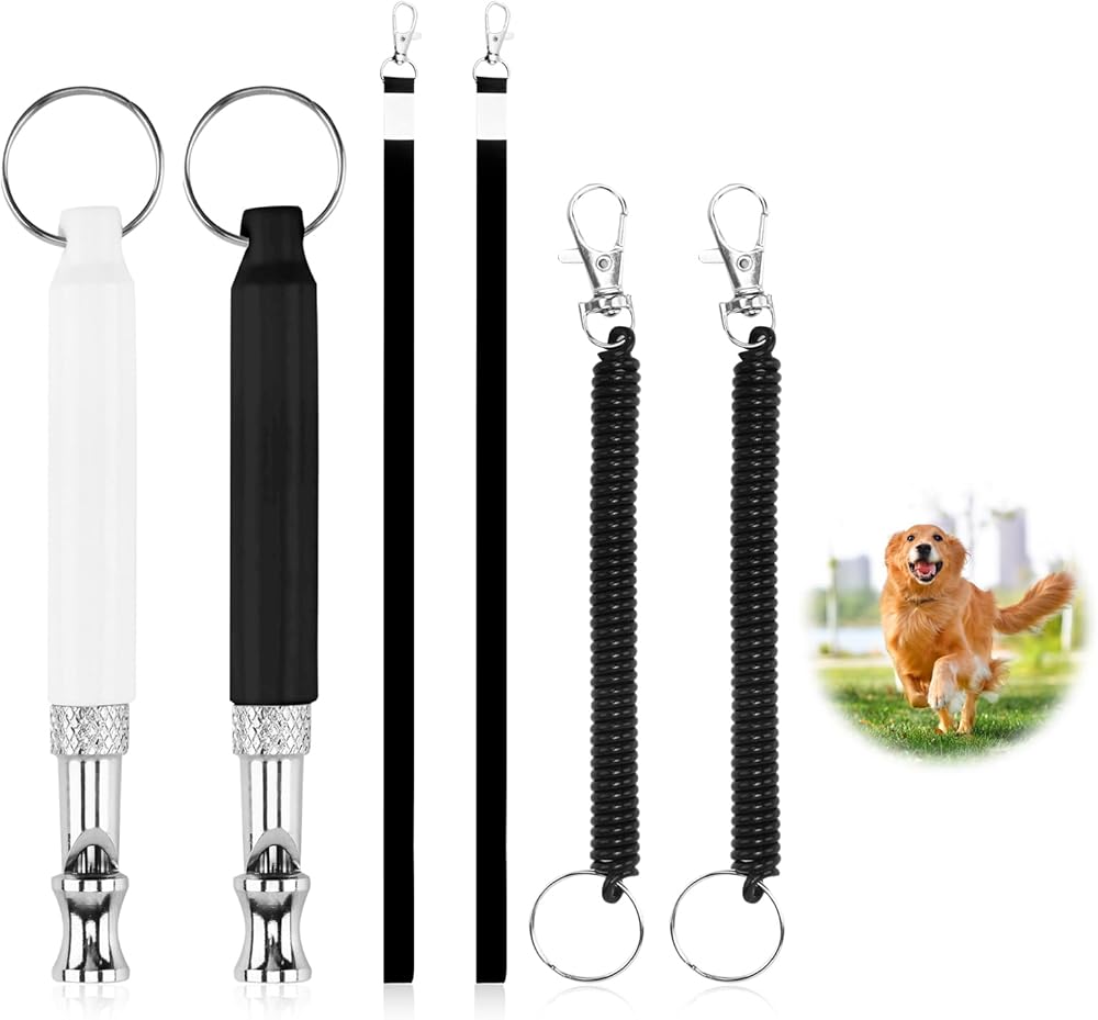 Product includes: 2 dog whistles, 2 lanyards, 2 wristbands