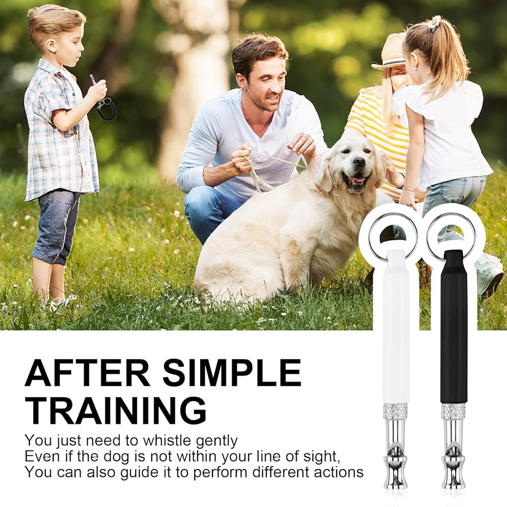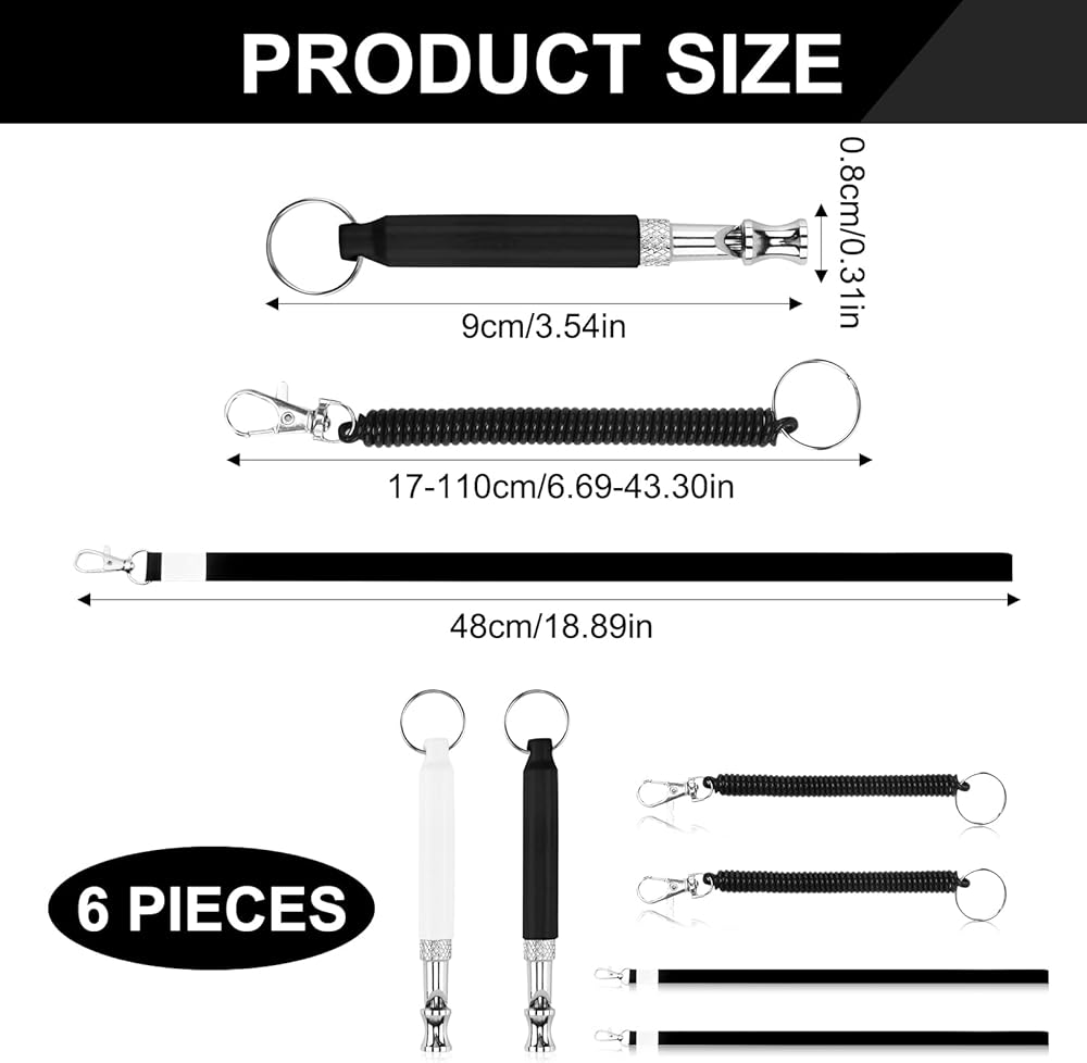 【Dog Training Whistle】You will get 2 Packs dog training whistle, Included 2 Pcs dog whistle (black and white), 2 Pcs black lanyard, 2 Pcs Elastic Wrist Strap, Can meet your usage needs.