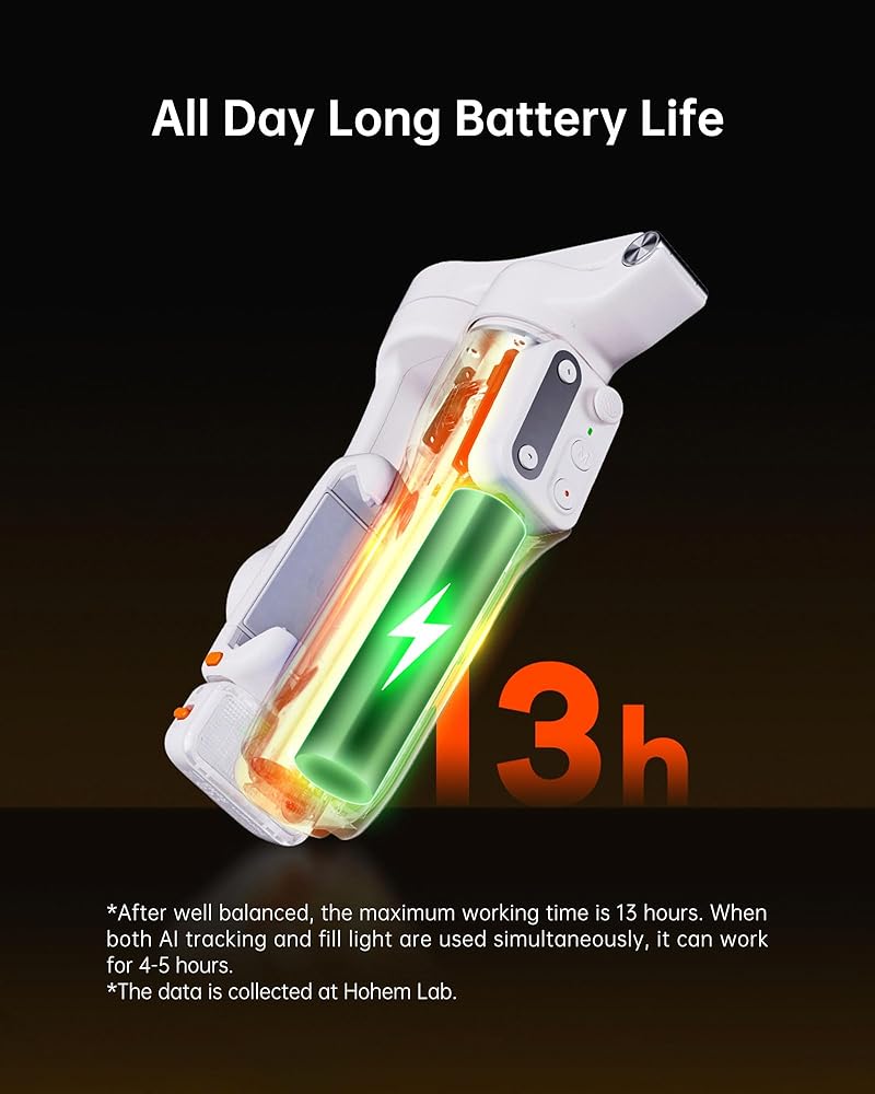 مستشعر تتبع الذكاء الاصطناعي مع ضوء ملء مغناطيسي: تم تجهيز Hohem iSteady V3 gimbal بمستشعر تتبع الذكاء الاصطناعي المغناطيسي الذي لا يحتاج إلى الاتصال بتطبيق منفصل أو يحتاج إلى مساعدة أي شخص لالتقاط كل حركة في الكاميرا بدقة. مع ثلاثة أوضاع إضاءة في المستشعر، يمكنك تسجيل لحظاتك حتى في الضوء الخافت.