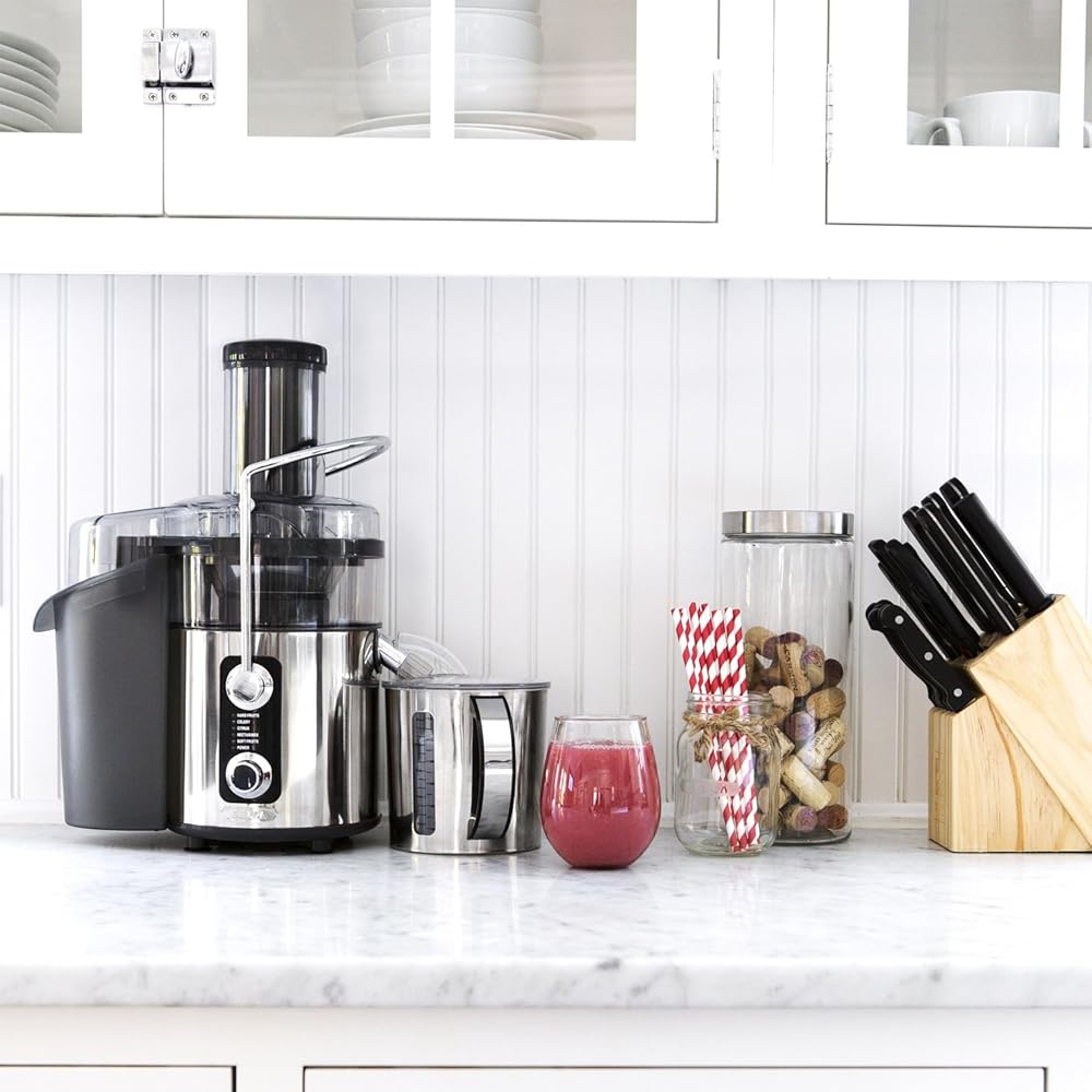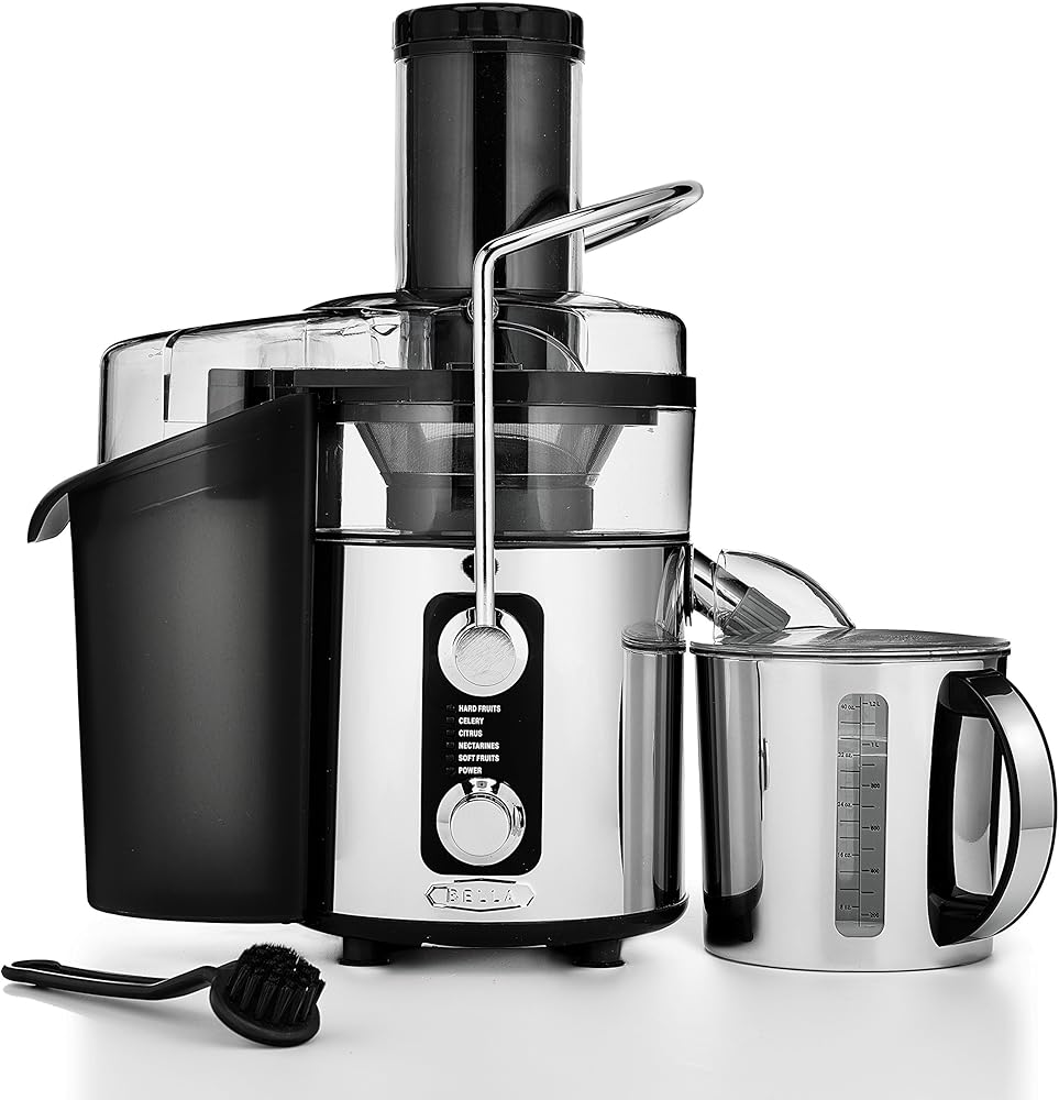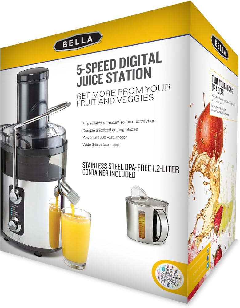 The BELLA 5-Speed Digital Juice Station features a 1,000 watt motor with five different juicing speeds to get the most out of your produce. Made of sleek, durable stainless steel, the BELLA 5-Speed Digital Juice Station looks great on any countertop. It includes a BPA-free pitcher with lid and a clear juice glass for your convenience. Get the most out of your fruits and veggies with the BELLA 5-Speed Digital Juice Station's five adjustable speeds. The speed control panel displays the most commonly juiced items by category to help you choose the right setting for maximum juice extraction. Options include hard vegetables, apple, pineapple, citrus, and soft fruits.