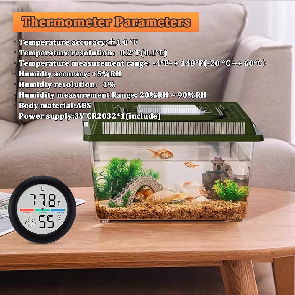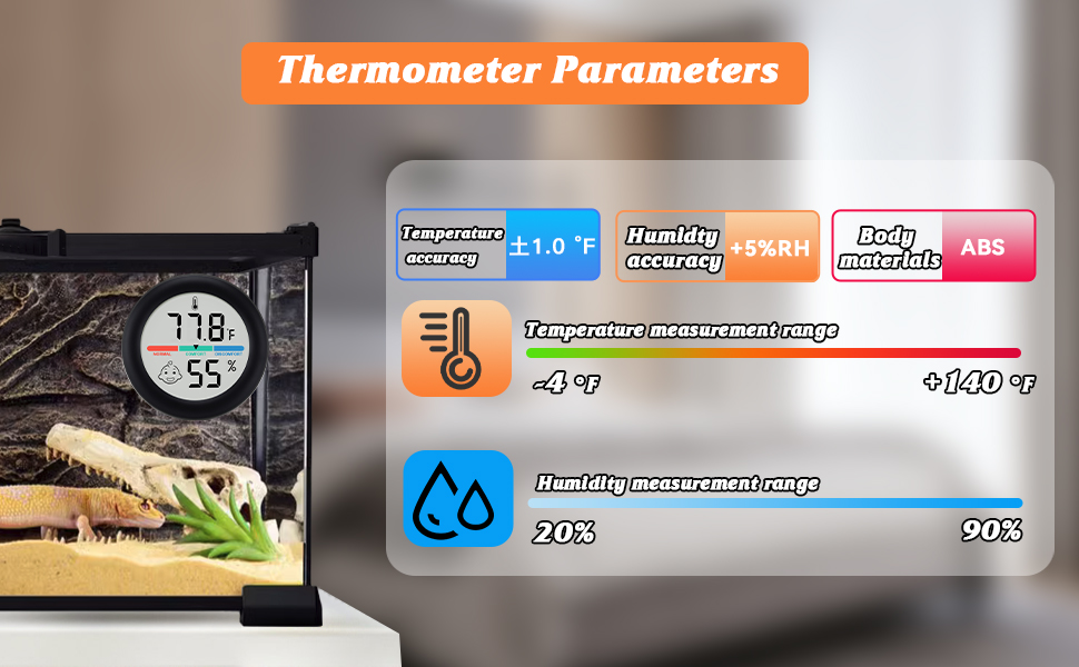 • [مقياس حرارة/مقياس رطوبة الزواحف عالي الدقة]: يستخدم مقياس حرارة الرطوبة الرقمي المحمول من Thlevel مستشعرًا متقدمًا لدرجة الحرارة والرطوبة مع شريحة قياس مدمجة عالية الدقة، والتي يمكنها قياس نطاق درجة الحرارة بدقة من -4 درجة فهرنهايت إلى 140 درجة فهرنهايت و نطاق الرطوبة النسبية 20% - 90% رطوبة نسبية.