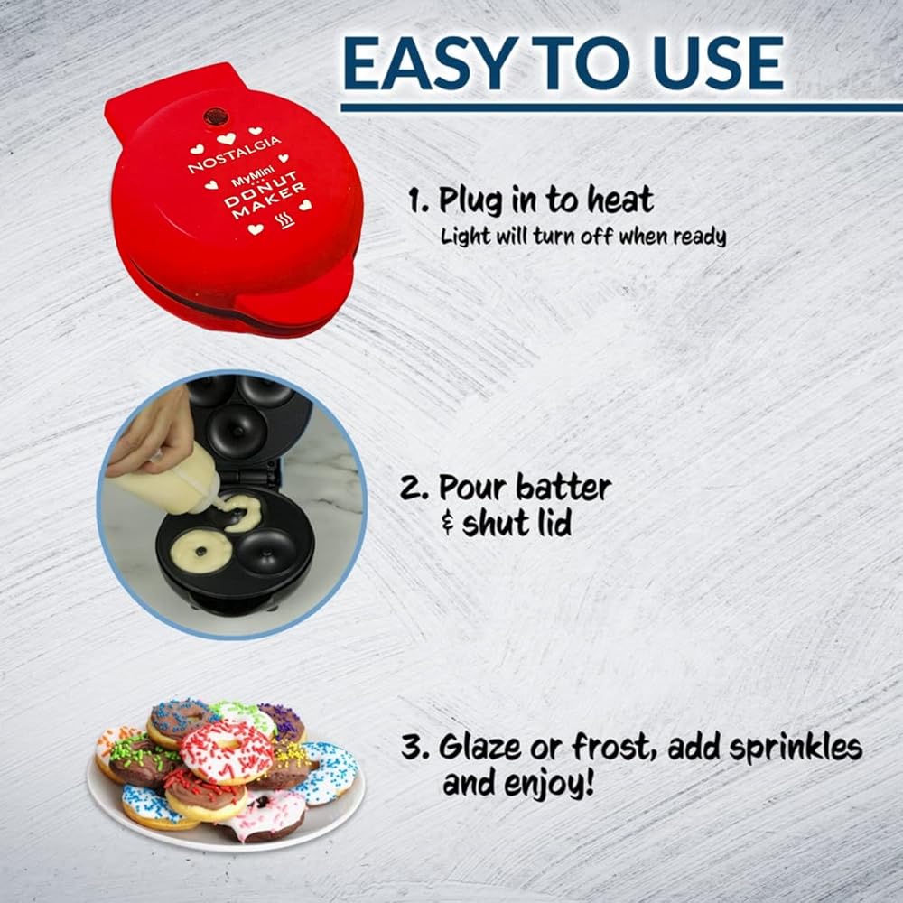 Create your own donut shop right in your house with Nostalgia MyMini Donut Maker! Frost or ice delicious homemade mini donuts for breakfast, lunch, or a snack. It's compact size and non-stick cooking surface allows for easy storage and cleanup. This mini donut maker is fun for a kids or the whole family!