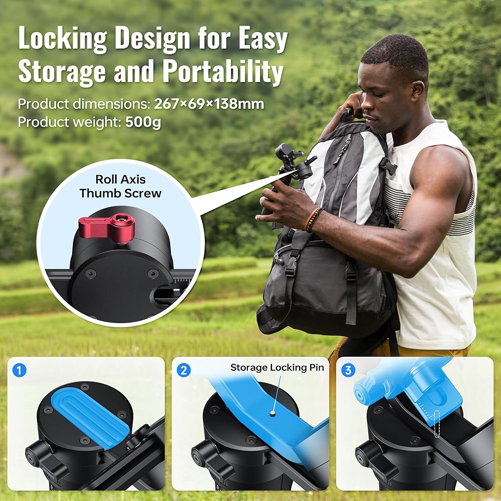 • تصميم القفل: يعتمد مثبت جيمبال Crane M2 للكاميرا على نظام قفل جيمبال ثلاثي المحاور، وهو أنيق ومرتب بعد التخزين، مما يجعله أكثر ملاءمة للتصوير والحمل.