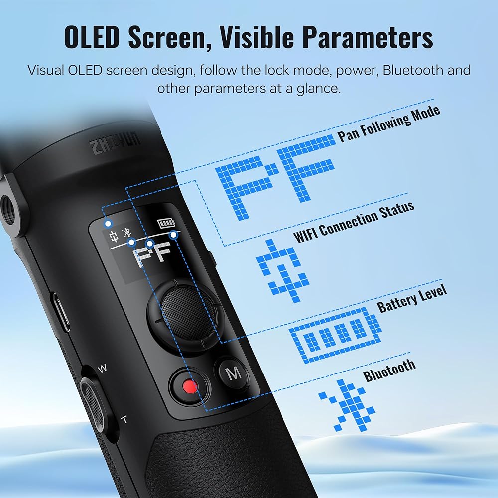 • واي فاي + بلوتوث، تحكم لاسلكي: يستخدم مثبت كاميرا Crane M2 وحدة تحكم مزدوجة الوضع واي فاي + بلوتوث جديدة، والتي تسمح لك بالتحكم في وظائف مختلفة مثل التقاط الصور وتسجيل مقاطع الفيديو من خلال المقبض بدون أسلاك.