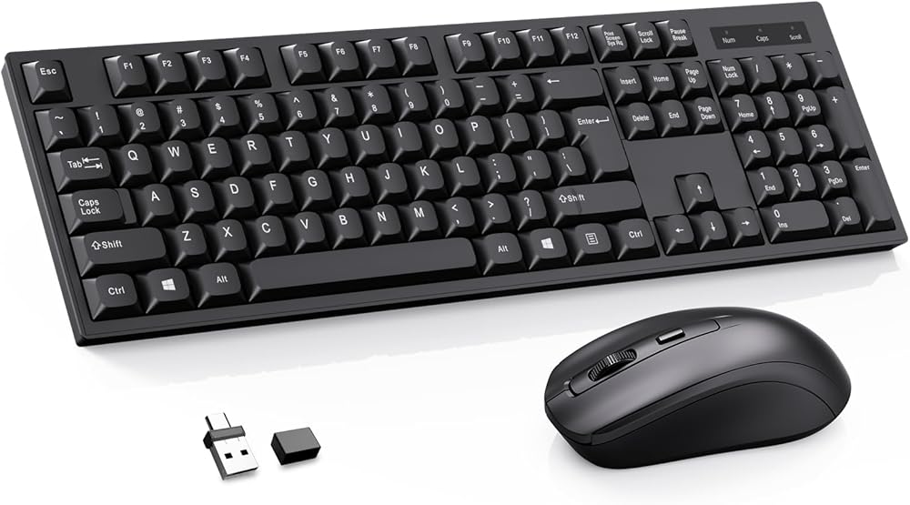 مجموعة لوحة مفاتيح وماوس لاسلكية - تصميم QWERTY بالحجم الكامل، غطاء مفاتيح استريو 2.4G مصمم هندسيًا لأجهزة الكمبيوتر المحمول، والكمبيوتر الشخصي، والكمبيوتر المحمول، والنوافذ، ولوحة المفاتيح الرقمية السلكية للكمبيوتر، مع جهاز استقبال USB-A وUSB-C 2 في 1
