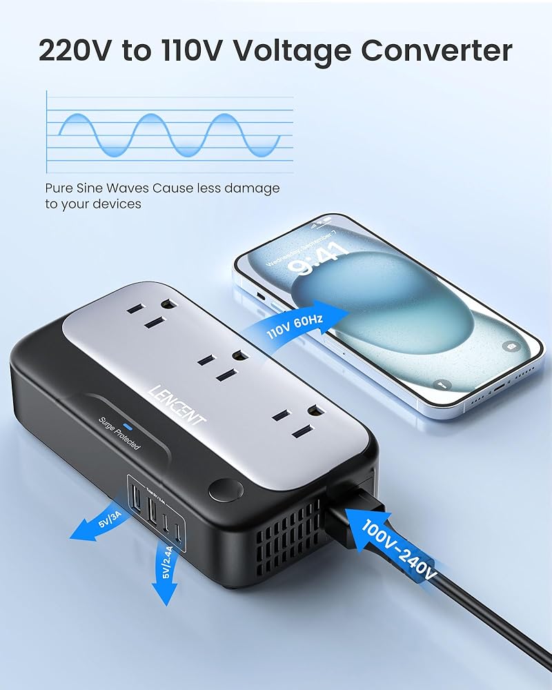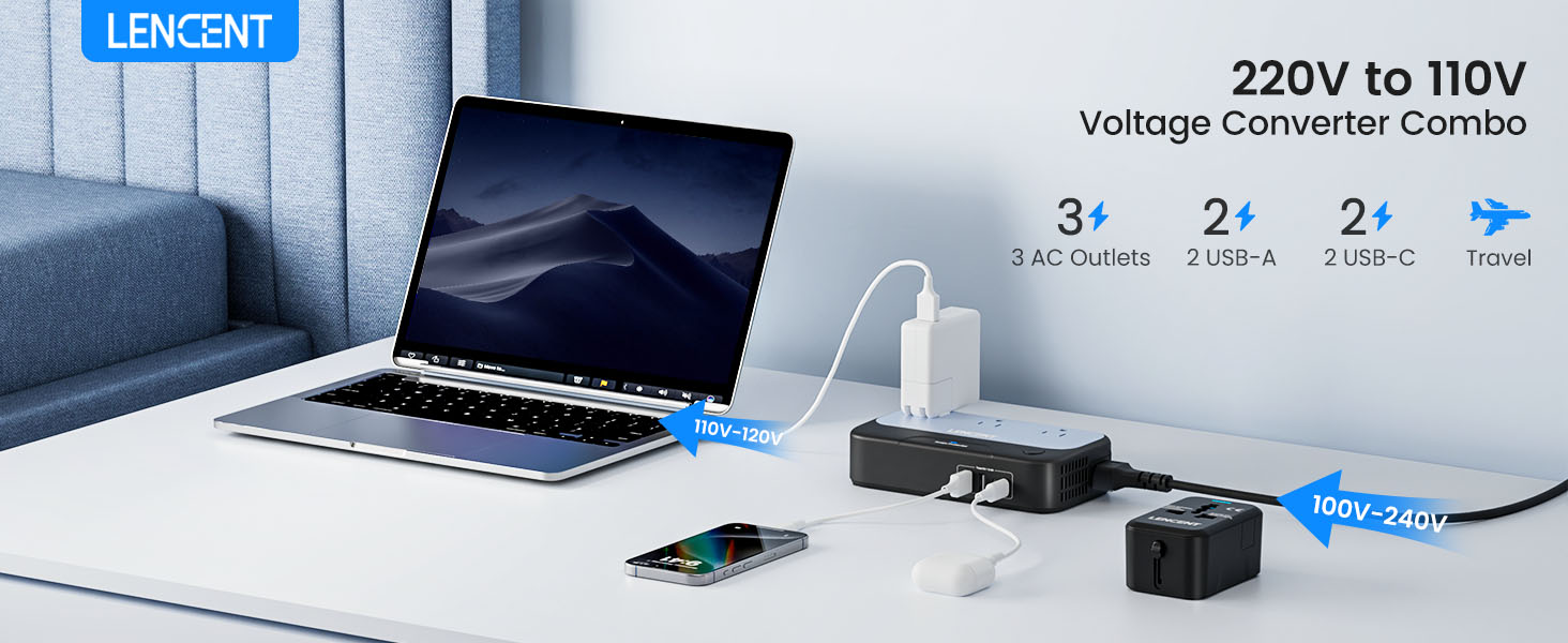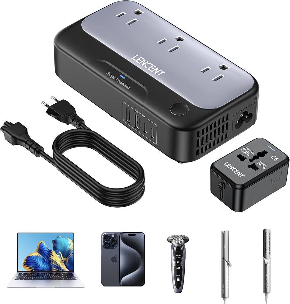 مجموعة محول الجهد الكهربي 220 فولت إلى 110 فولت: يمكن لمحول السفر LENCENT خفض الفولتية المختلفة (100-240 فولت، 50/60 هرتز) إلى المعيار الأمريكي (100-125 فولت، 50/60 هرتز). يشتمل على سلك طاقة أوروبي قابل للفصل ومحول قابس دولي (المملكة المتحدة/الاتحاد الأفريقي/الولايات المتحدة/الاتحاد الأوروبي)، مما يجعله مثاليًا لاستخدام الأجهزة الإلكترونية الأمريكية في أكثر من 200 دولة مثل المملكة المتحدة وإيطاليا وفرنسا وألمانيا وأستراليا وتايلاند ودبي. ، والصين