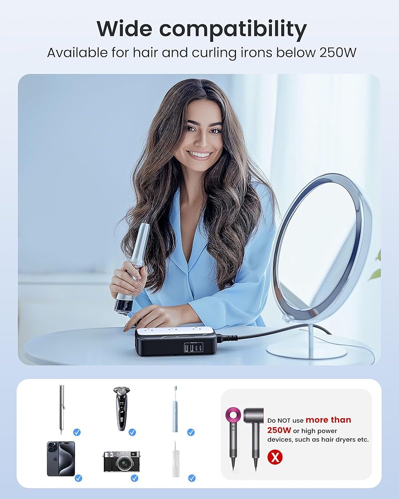 عمل فائق الهدوء: يستخدم محول السفر الأوروبي لمجففات الشعر تقنية موجة جيبية نقية لإخراج تيار ثابت، ومعدل تحويل معزز (يصل إلى 95%)، وتبديد الحرارة الفعال، والحد الأدنى من الضوضاء. إلى جانب التصميم بدون مروحة، فإن شريط الطاقة هذا هادئ للغاية أثناء الاستخدام، مما يعزز النوم دون إزعاج، حتى أثناء الاستخدام الليلي.
