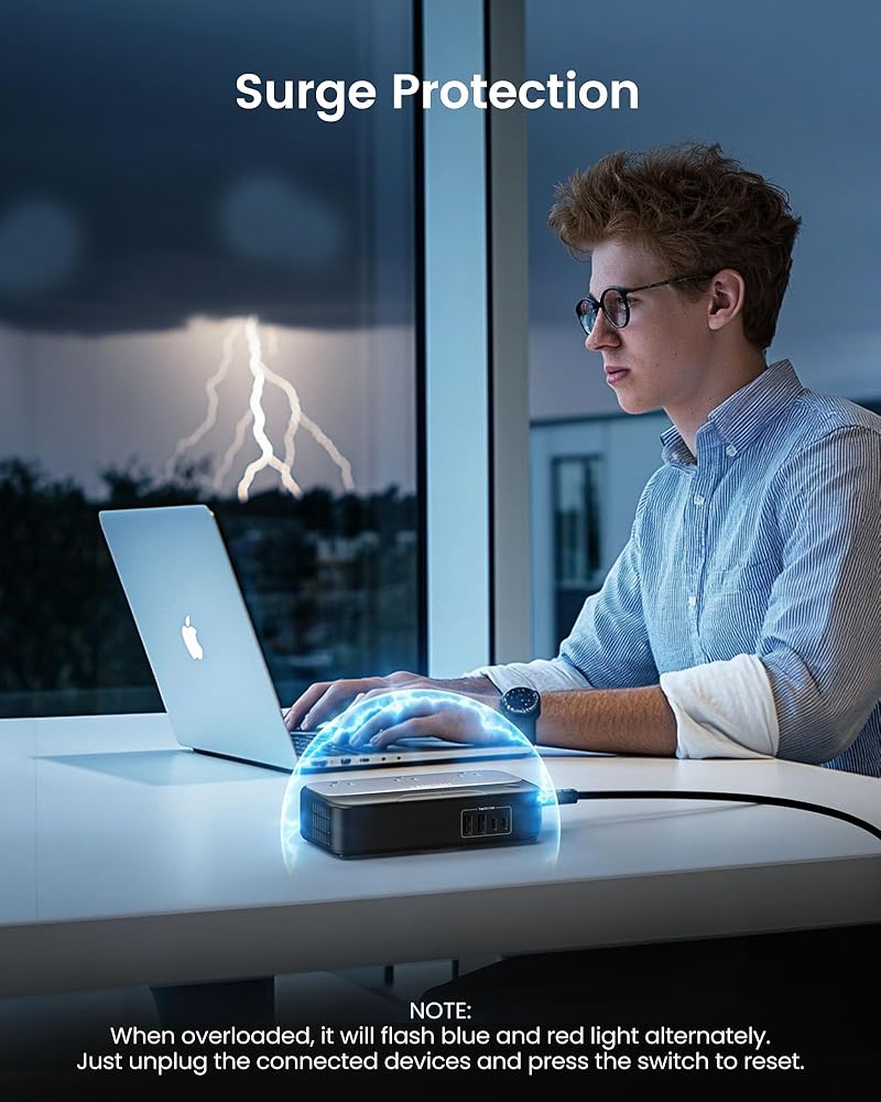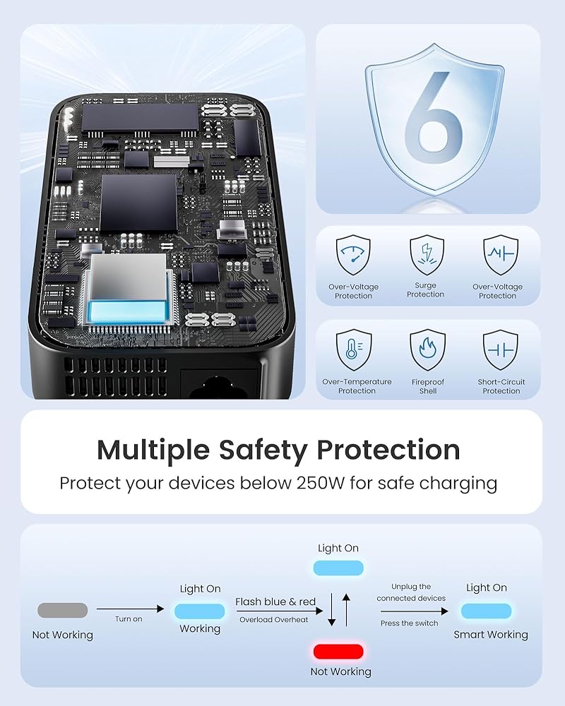 السلامة مضمونة وعملية: مصنوع من مادة مقاومة للحريق تبلغ 1382 درجة فهرنهايت وواقي مدمج من زيادة التيار، يحمي هذا المحول أجهزتك من الجهد الزائد، والحمل الزائد، والتيار الزائد، والدائرة القصيرة، ودرجة الحرارة الزائدة. (ملاحظة: لا تستخدم مجففات الشعر والمكاوي والغلايات والأجهزة الأخرى التي تزيد عن 250 واط. عند التحميل الزائد، سيومض ضوء المؤشر باللونين الأزرق والأحمر بالتناوب. ما عليك سوى إيقاف تشغيله وفصل الأجهزة المتصلة، ثم اضغط على المفتاح لإعادة الضبط)