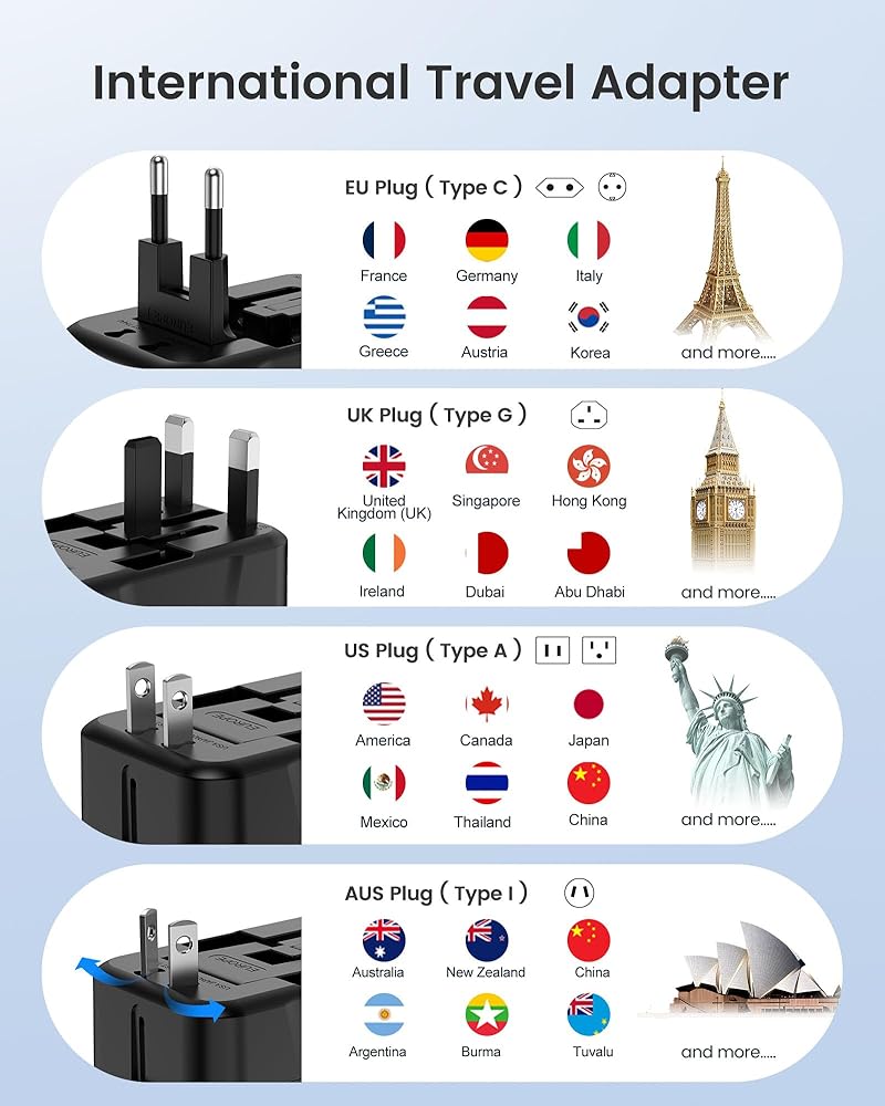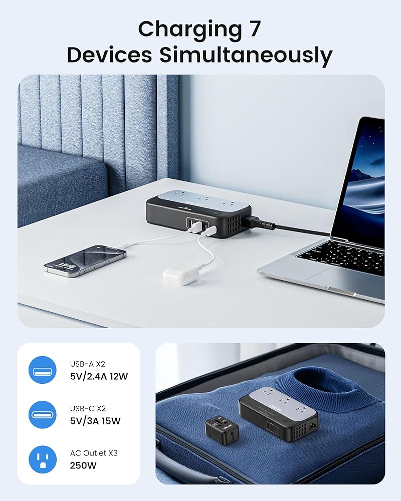محول طاقة دولي 7 في 1: محول السفر الخاص بنا يحول المقبس الأجنبي إلى 3 منافذ تيار متردد أمريكية (250 واط كحد أقصى)، 2 USB-C (5 فولت/3 أمبير، 15 واط كحد أقصى) و2 USB-A (5 فولت) /2.4 أمبير، 12 واط كحد أقصى)، مما يسمح لك بشحن 7 أجهزة في وقت واحد. يلبي هذا الحل المكون من قطعة واحدة احتياجات الشحن المختلفة أثناء السفر إلى الخارج، وهو مثالي لأجهزة تمليس الشعر ومكواة تجعيد الشعر والهواتف المحمولة وأجهزة الكمبيوتر المحمولة والكاميرات وبنوك الطاقة وشفرات الحلاقة والمزيد.