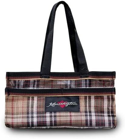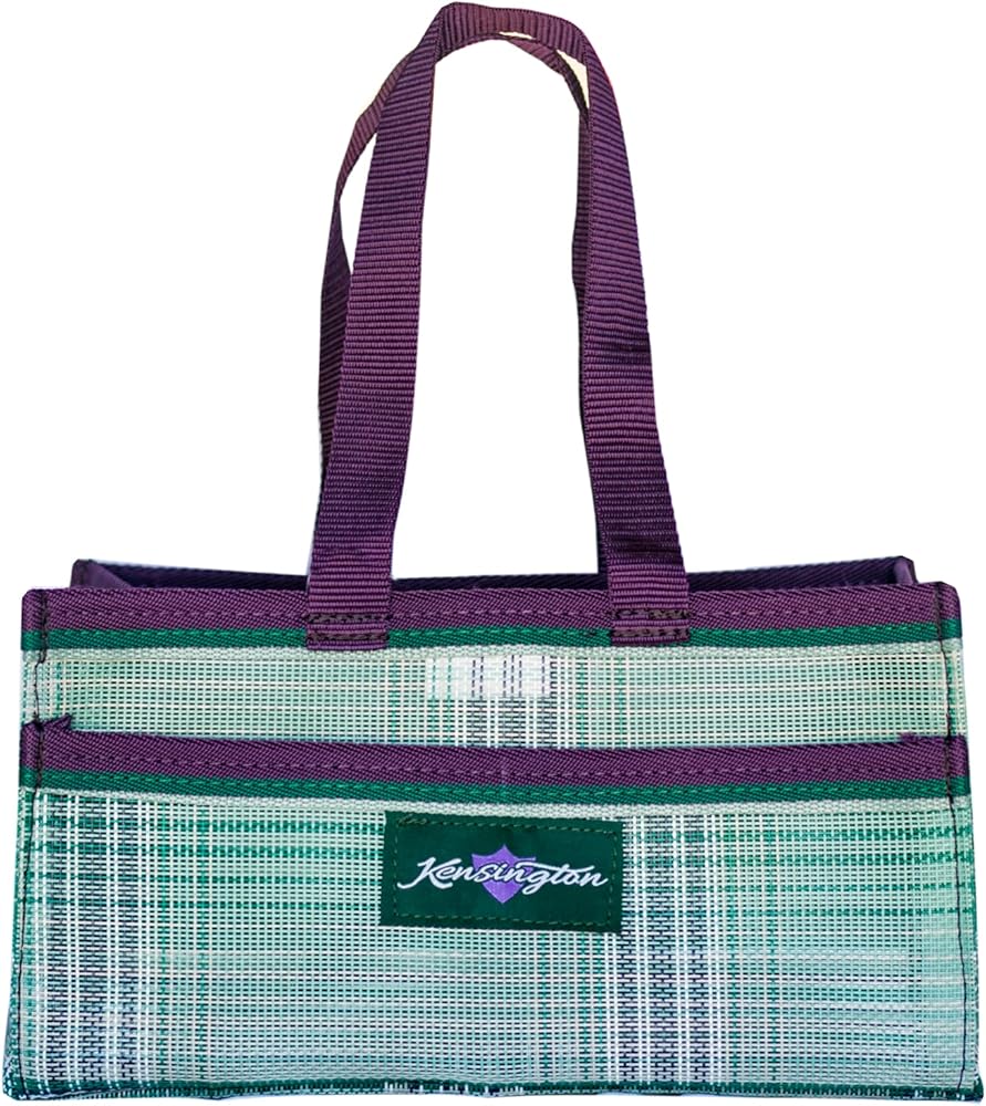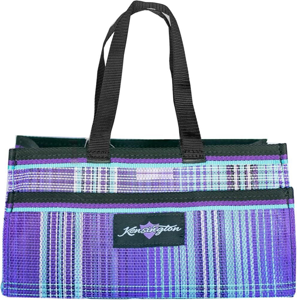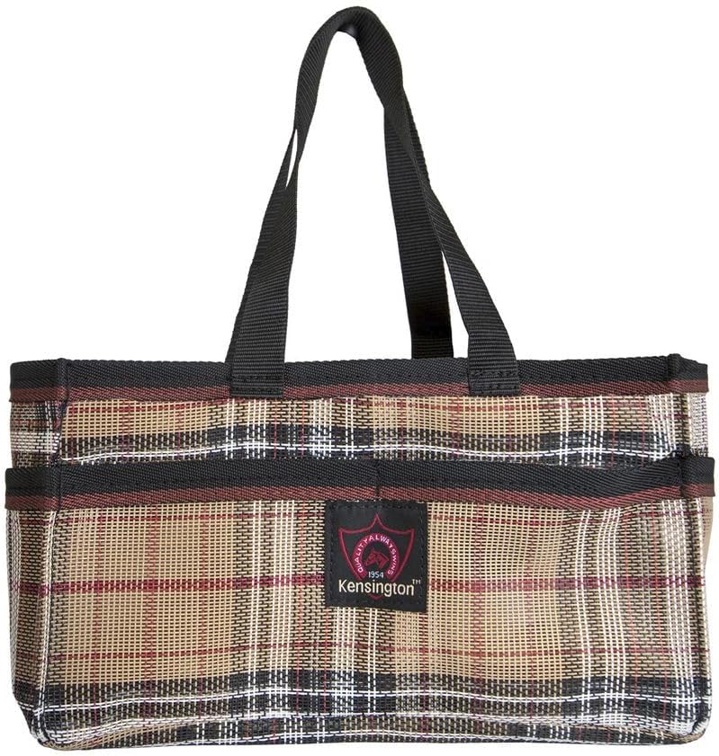 Kensington Grooming Tote The Kensington Grooming Tote is a convenient and stylish way to carry your grooming and health supplies! Its super easy to clean and has numerous pockets to keep you organized. Made of durable Textilene mesh for easy cleaning; the roomy interior compartment measures 12"x7"x7". The exterior pockets are perfect for holding everything from hoof picks to combs. Two extra long handles make it comfortable to carry even with tall shampoo bottles. Features: Pockets on all 4 outer sides Double handles Item Specifications: Material: Textilene mesh Size: 12" x 7" x 7"