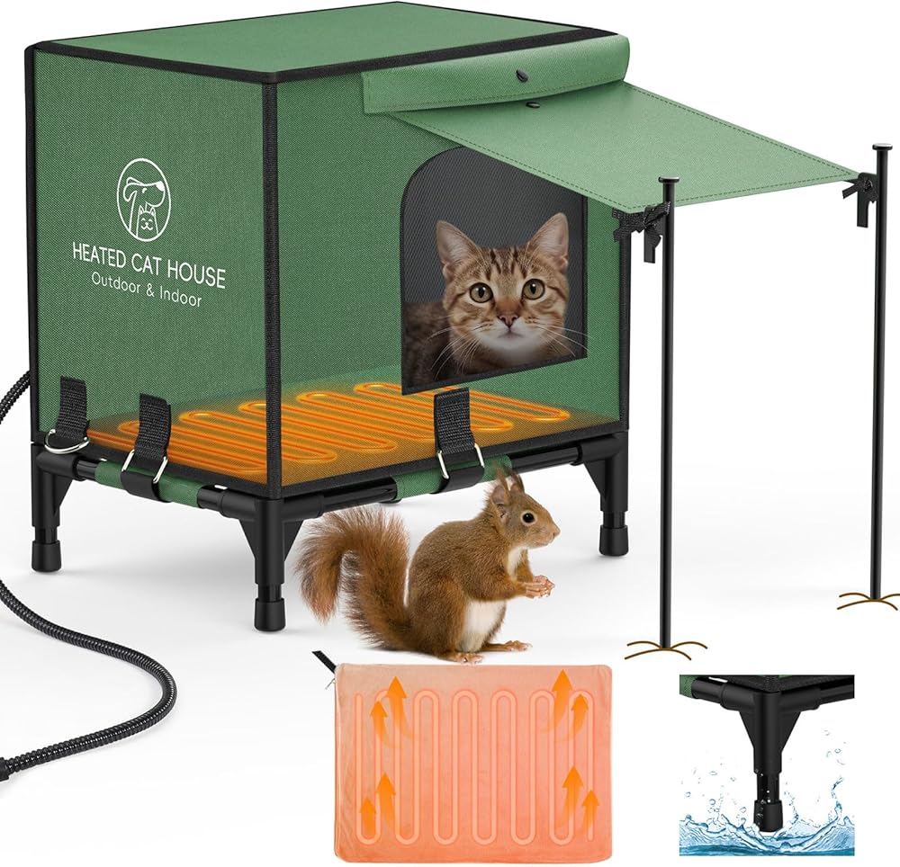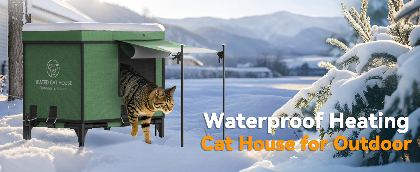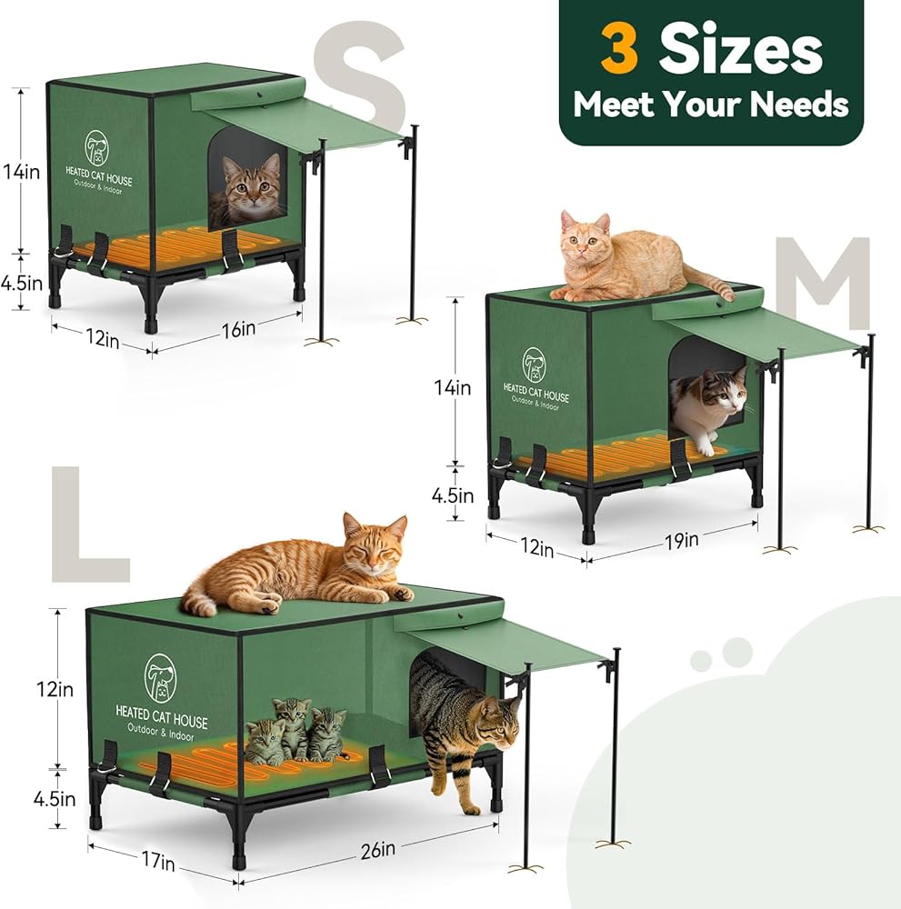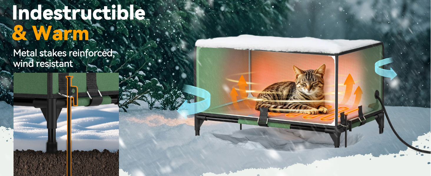• تصميم مظلة كبيرة وغير قابلة للتدمير - تم بناء بيت القطط المُدفأ هذا بهيكل قوي للغاية، ويتحمل الطقس القاسي والتأثيرات العرضية، مما يضمن سلامة الحيوانات الأليفة في الهواء الطلق. تصميم جديد ومطوَّر للمظلة الكبيرة يمنع المطر والثلج من دخول بيت القطط الخارجي.