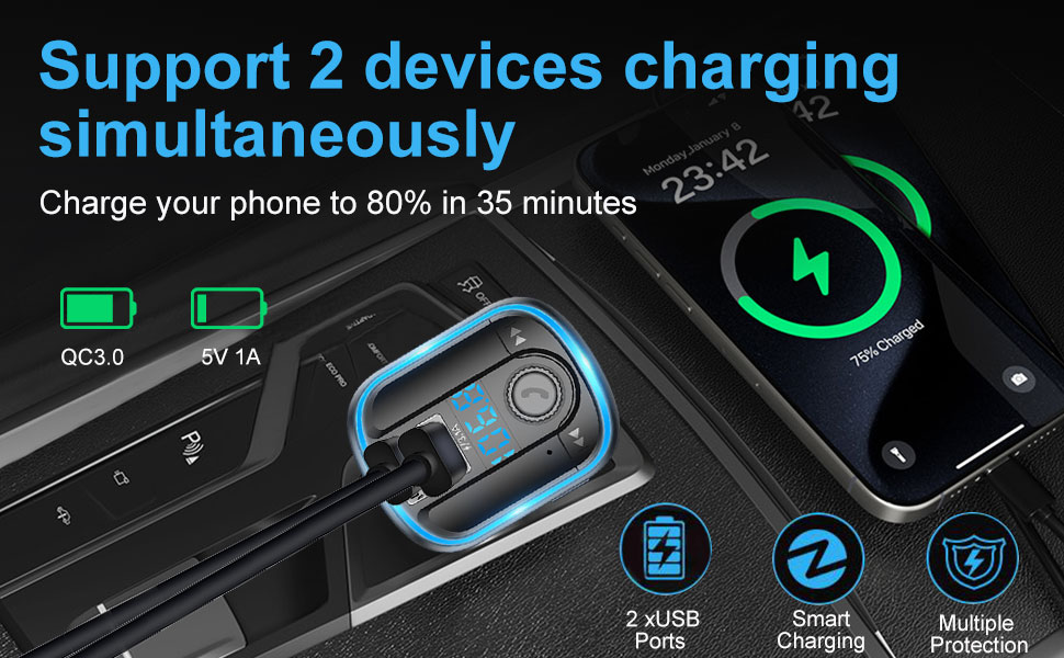 ✿[شحن سريع QC3.0 وشحن آمن] يأتي محول السيارة بلوتوث مع منفذي USB (5V-1A وQC 3.0)، ويمكنه شحن جهازين في وقت واحد. بفضل منفذ QC3.0 USB، يمكنه شحن الأجهزة المتوافقة بنسبة 80% خلال 35 دقيقة. حماية مدمجة من التيار الزائد، وحماية من الجهد الزائد لضمان الشحن الآمن بفعالية.
