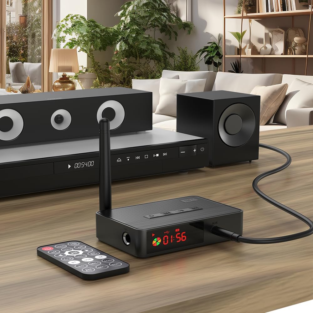 جهاز استقبال eppfun Bluetooth 5.3 للستيريو المنزلي، محول صوت بلوتوث إلى RCA لمكبرات الصوت الاستريو / نظام ستيريو للبث، جهاز تحكم عن بعد RF، NFC/بصري/محوري/RCA/Aux/TF بطاقة/Udisk