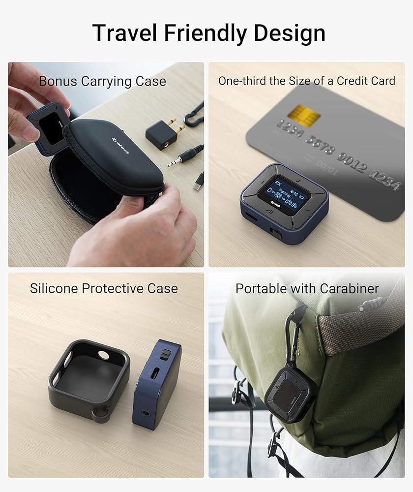 • صُنع خصيصًا للطيران الخاص بك: يتميز جهاز إرسال البلوتوث المدمج الخاص بالطائرة بأنه خفيف الوزن بشكل ملحوظ، حيث يبلغ حجمه ثلث حجم بطاقة الائتمان فقط. يمكنك حملها بسهولة دون أي وزن إضافي. تتيح لك حلقة التثبيت تثبيت مقسم البلوتوث بسهولة على حقيبة الظهر أو الحزام للوصول السريع. بالإضافة إلى ذلك، تضمن حقيبة الحمل المصممة بدقة تنظيمًا سلسًا لمحول بلوتوث السفر وملحقاته، مما يزيد من كفاءة المساحة في حقيبة ظهرك!