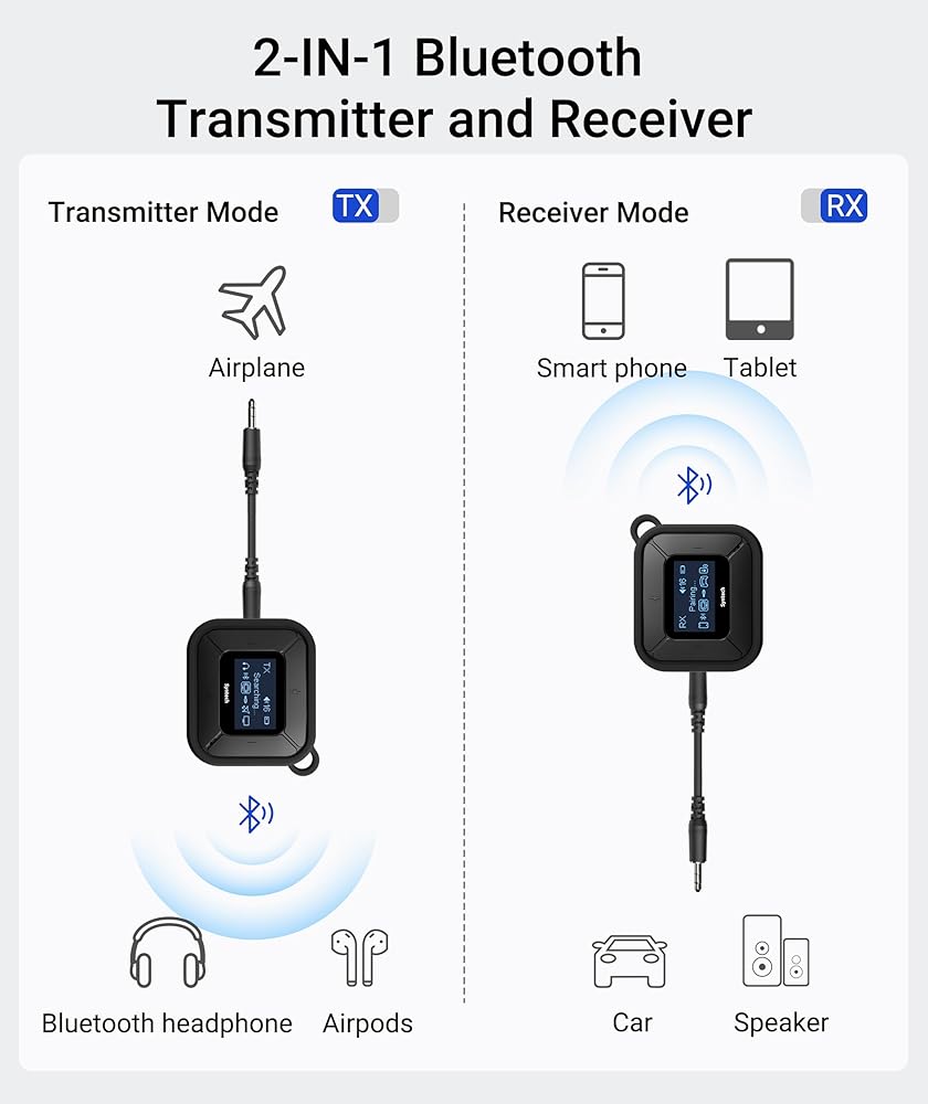 • جهاز استقبال إرسال بلوتوث 2 في 1: ارفع تجربتك الصوتية مع محول بلوتوث AUX متعدد الاستخدامات! في وضع الإرسال، استمتع بالاتصال اللاسلكي بأنظمة الترفيه على متن الطائرة، ومعدات الصالة الرياضية، وأجهزة التلفزيون. بالإضافة إلى ذلك، من أجل التكامل السلس مع واجهات الصوت المختلفة للطائرة، قمنا بتضمين محول AUX مزدوج 3.5 ملم من أجل راحتك. قم بالتبديل إلى وضع الاستقبال بسهولة لدفق الصوت من هاتفك أو جهازك اللوحي إلى مكبرات الصوت السلكية أو نظام استريو السيارة.