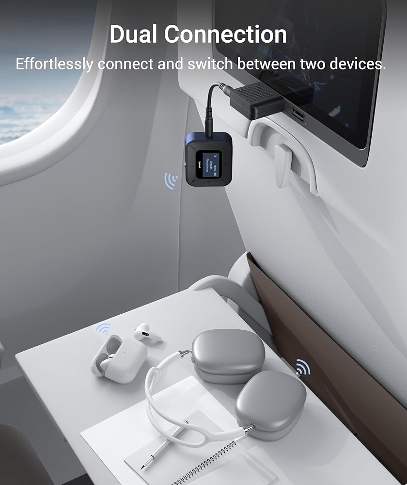• شاشة عرض عالية الدقة وإقران مزدوج: استمتع بالتشغيل السلس مع شاشة العرض الواضحة لمحول سماعة الرأس الخاص بنا. تساعدك هذه الميزة على تتبع حالة المحول بسهولة، وتحديد أي مشكلات بسرعة، وتجنب الاتصالات غير الصحيحة. ومع دعم الاقتران المزدوج، يمكنك مشاركة المرح مع صديقك دون عناء، والغوص في عالم من الموسيقى والأفلام الغامرة معًا.