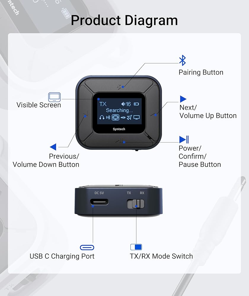 • استقرار اتصال لا مثيل له: مدعوم بتقنية Bluetooth 5.3 المتطورة، يوفر جهاز إرسال الصوت Syntech Bluetooth جودة صوت رائعة مع زمن وصول منخفض بشكل مثير للإعجاب. تحرك بحرية ضمن نطاق 15 مترًا، حتى عندما يكون هاتفك على مسافة، واستمتع بموسيقى ثابتة دون انقطاع. علاوة على ذلك، يوفر جهاز إرسال واستقبال البلوتوث الخاص بنا التوافق مع الإصدارات السابقة مع Bluetooth 5.2 و5.0 و4.2 و4.0 و3.0 و2.0، مما يضمن الاتصال السلس لأجهزتك.