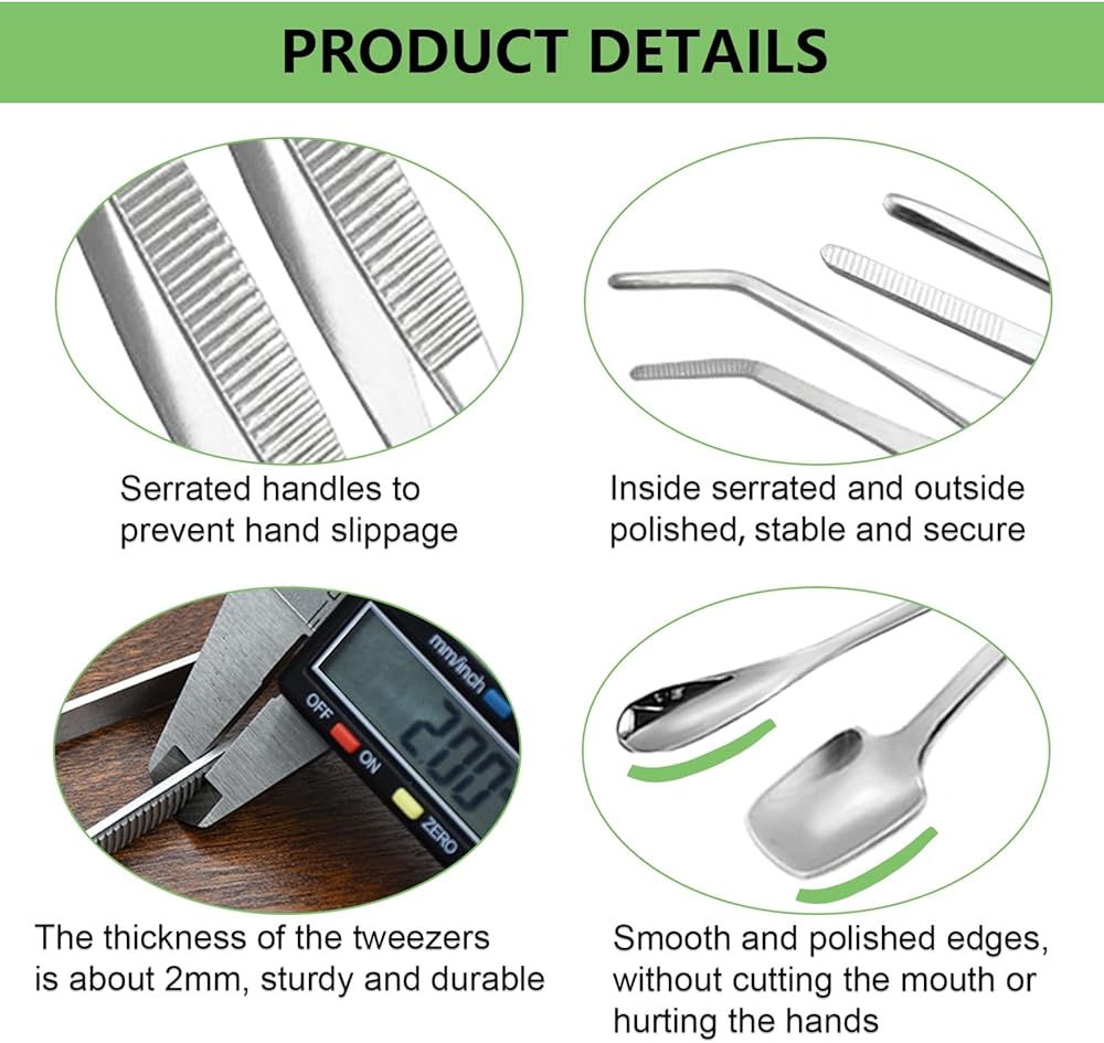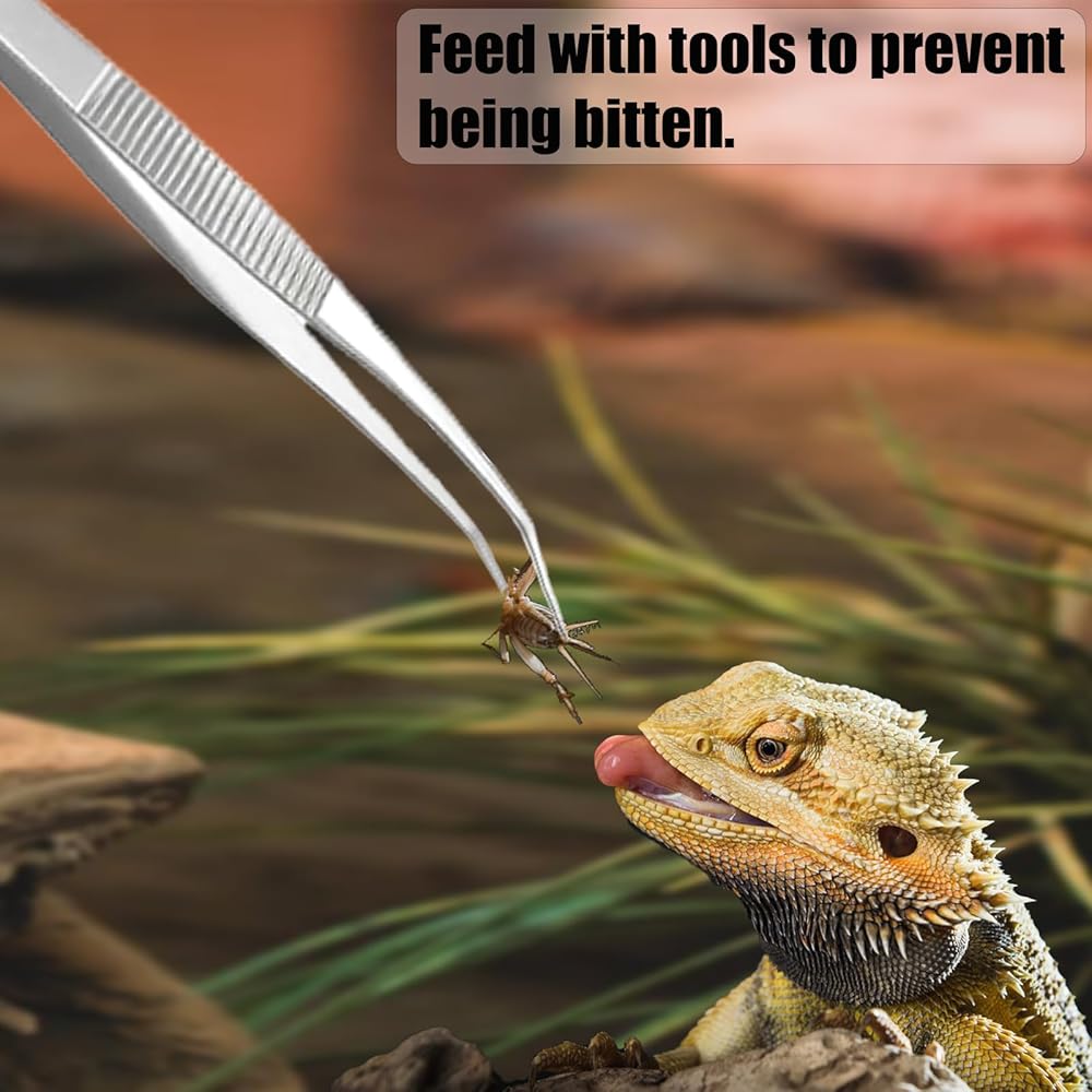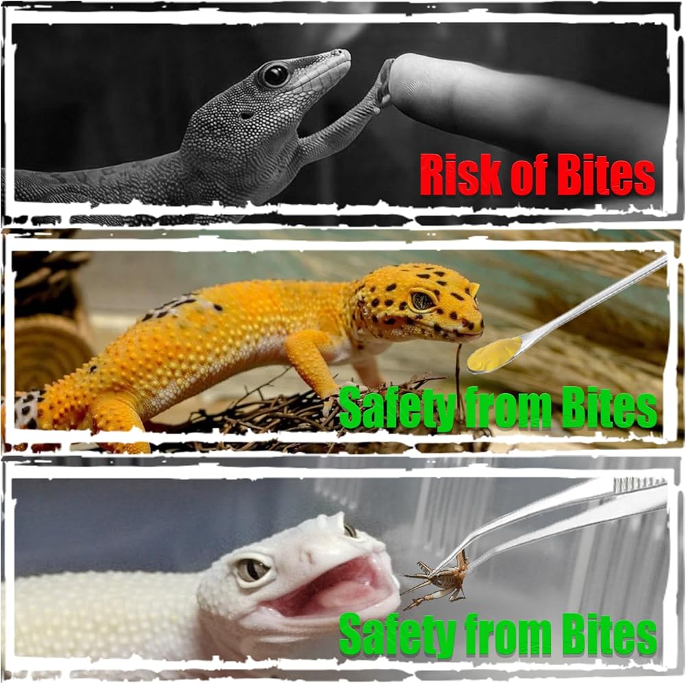 قبضة مضادة للانزلاق: تتميز كل من أطراف ومقابض ملقط التغذية بتصميم مسنن، مما يوفر قبضة آمنة ويمنع الانزلاق أثناء الاستخدام. وهذا يضمن تغذية آمنة ودقيقة للزواحف الخاصة بك.