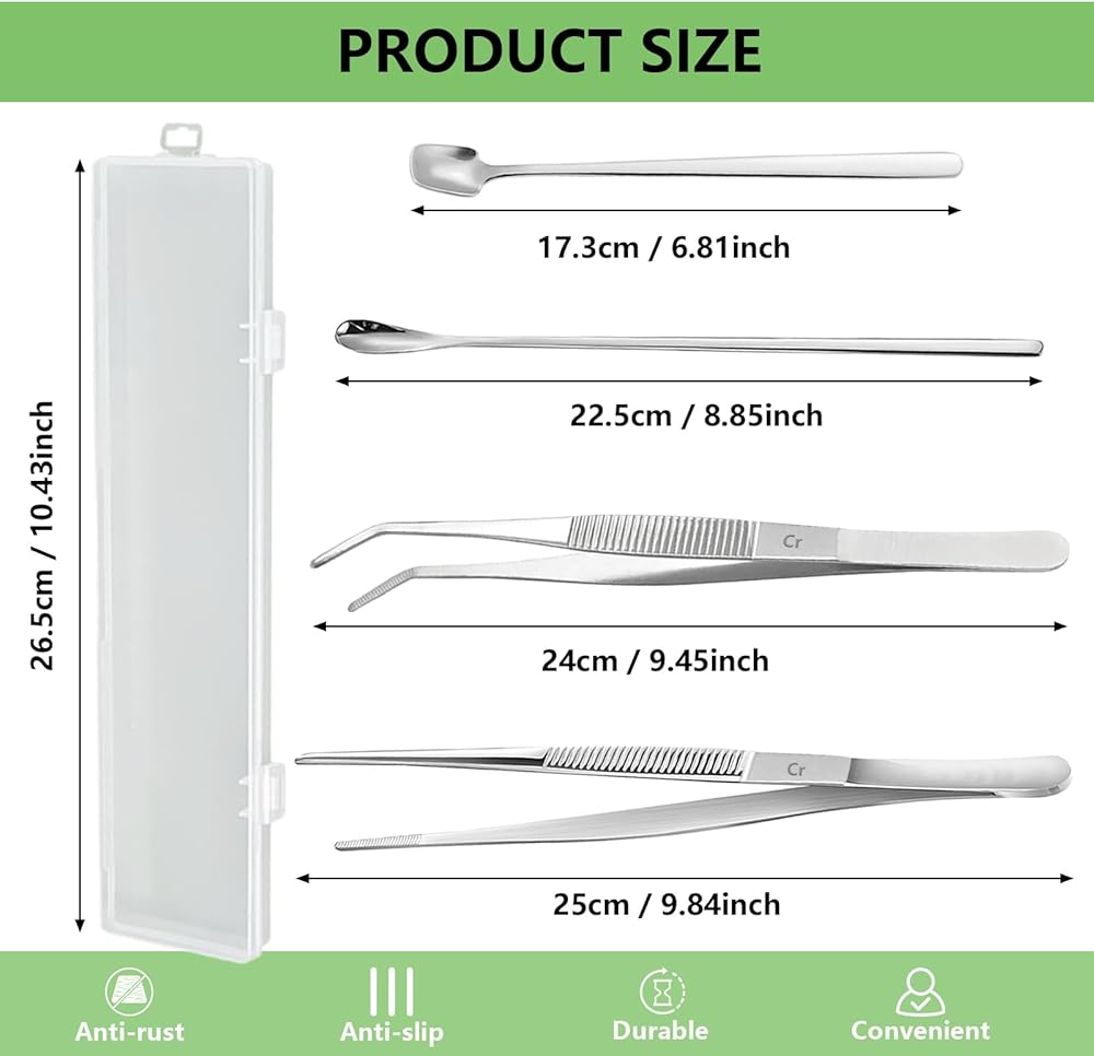 ما يتضمن: تتضمن هذه المجموعة ملقطًا واحدًا للتغذية مستقيمًا، وملقطًا واحدًا للتغذية منحنيًا، وملعقتين لتغذية تنين اللحية، وصندوقًا واحدًا لتخزين الأدوات. كل ما تحتاجه لتغذية الزواحف بكفاءة يتم تنظيمه بشكل ملائم في عبوة واحدة.