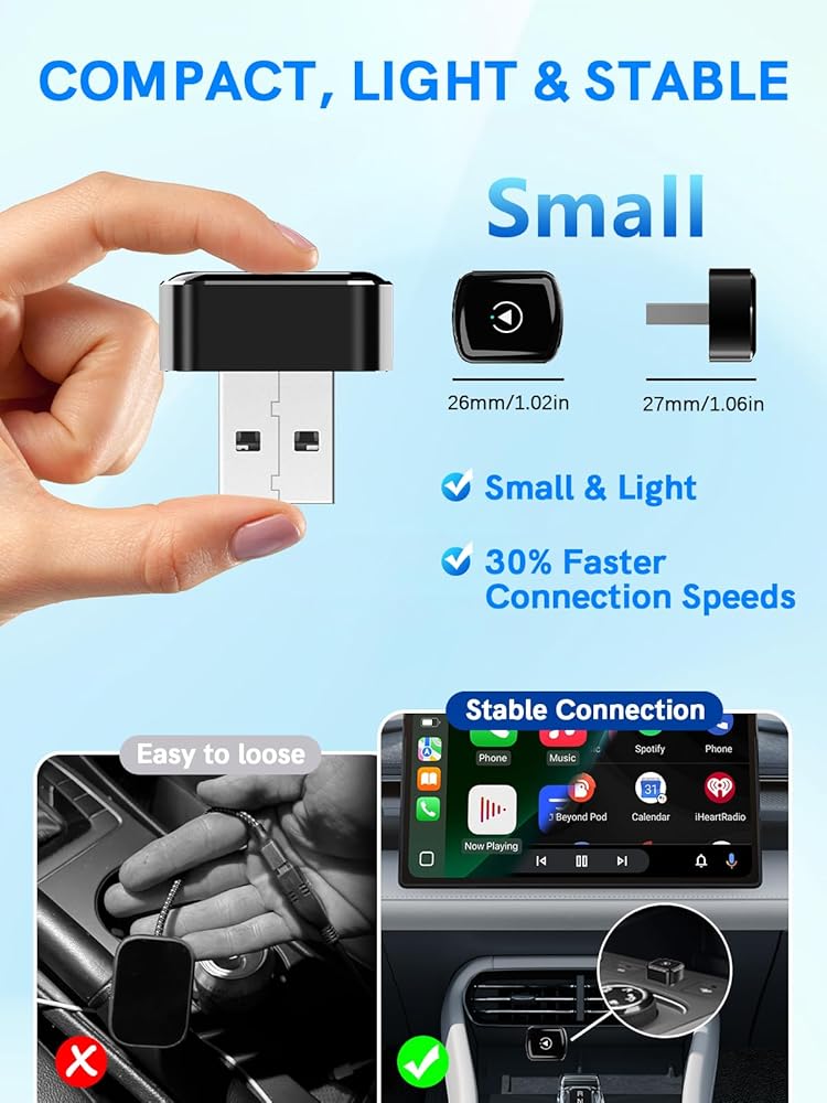 • 【إعداد سريع وسهل الاستخدام 】يمكن إعداده بسهولة في 3 خطوات فقط. قبل الاستخدام لأول مرة، قم بتوصيل المحول بمنفذ USB في سيارتك، وقم بتشغيل Bluetooth وWiFi على هاتفك، وقم بإقرانه مع CarPlay. بعد الإعداد لأول مرة، يتم توصيله وتشغيله، ويمكنه تحديد الاتصال بسرعة وتلقائيًا في كل مرة تبدأ فيها تشغيل السيارة