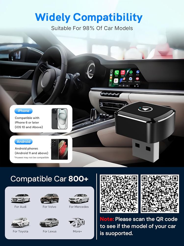 • 【متوافق مع أكثر من 800 مركبة】يتوافق محول Carplay اللاسلكي الخاص بنا مع أكثر من 800 طراز مع Carplay السلكية المثبتة في المصنع. للتحقق مما إذا كانت سيارتك تدعم Carplay، ما عليك سوى توصيل سيارتك بكابل iPhone الأصلي أو التحقق من مواصفات سيارتك