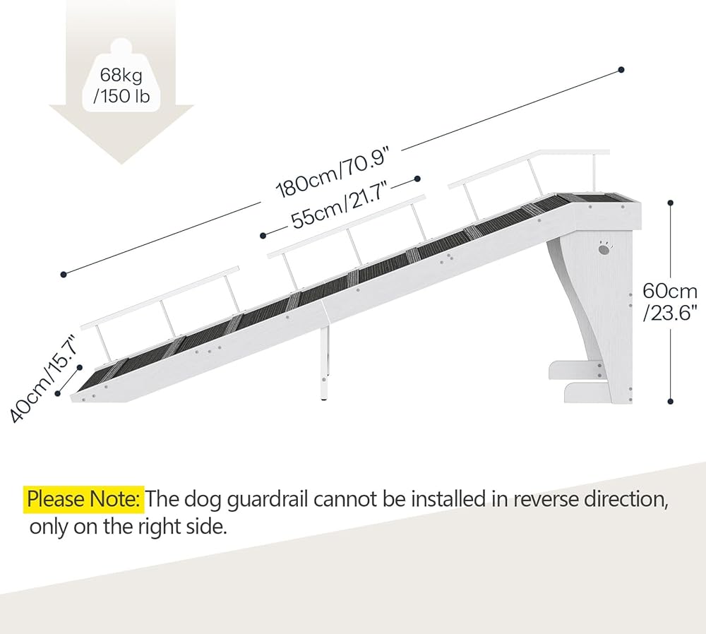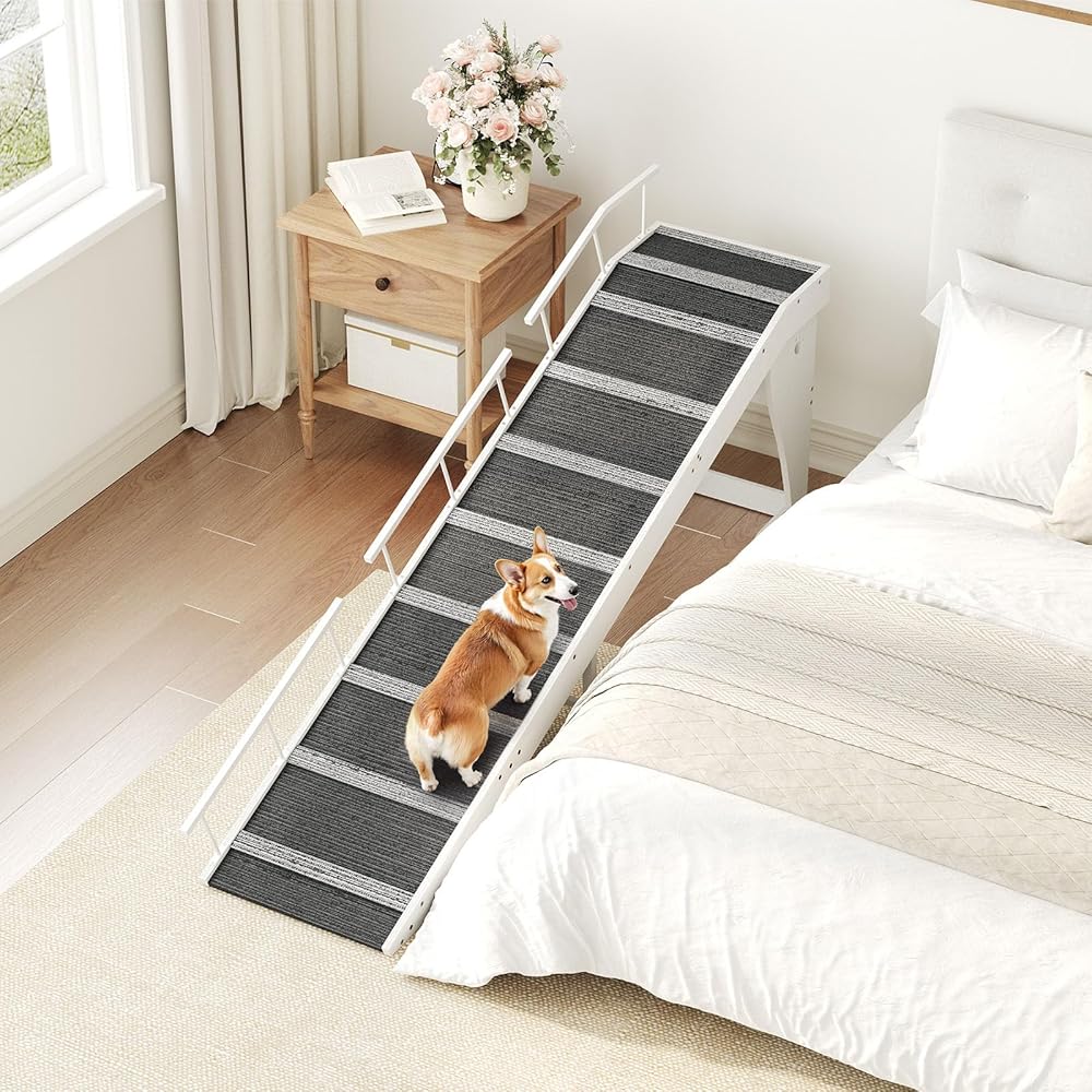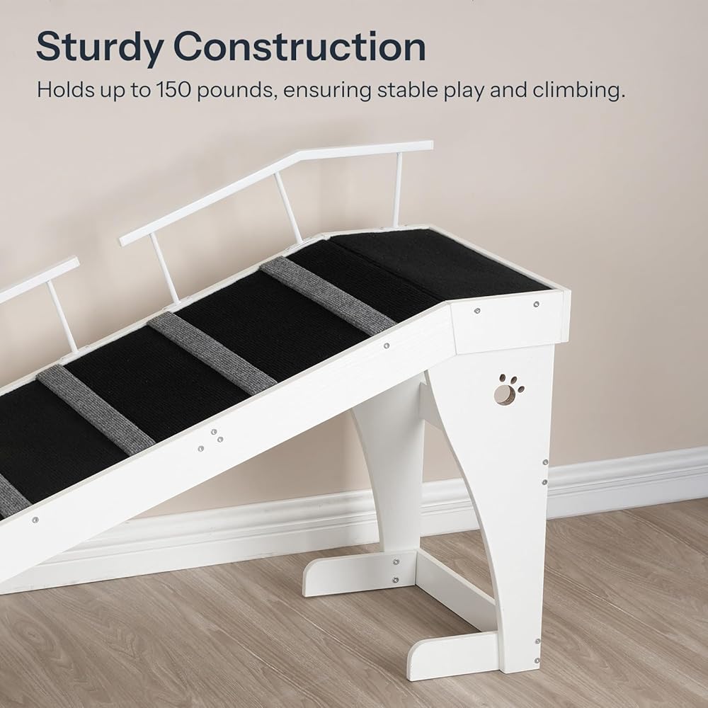 منحدر طويل لسهولة الوصول: يساعد المنحدر الطويل 70.9 بوصة مع منحدر لطيف 20 درجة حيوانك الأليف على التحرك لأعلى ولأسفل بسهولة. منصة عالية 23.6 بوصة (7.9 بوصة طول × 15.7 بوصة عرض) في الأعلى توفر مكانًا للراحة قبل السطح يتغير. التصميم المدروس يحافظ على سلامة الحيوانات الأليفة وراحتها