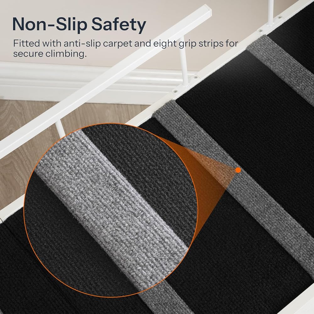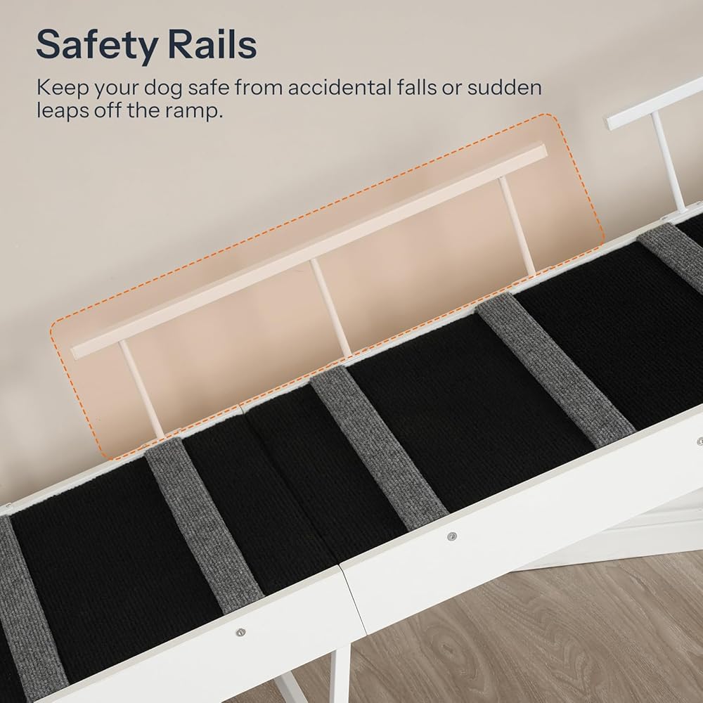 أمان ضد الانزلاق: نسيج السجاد المضاد للانزلاق و8 أشرطة أفقية غير قابلة للانزلاق تزيد من الاحتكاك بين أقدام كلبك والمنحدر، مما يعزز الجر والسلامة لمنع الانزلاق أثناء التسلق. تحافظ قضبان الأمان الجانبية على أمان الكلاب أثناء التسلق