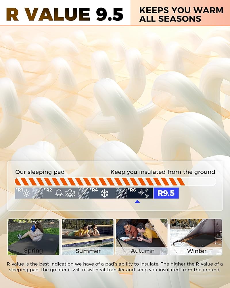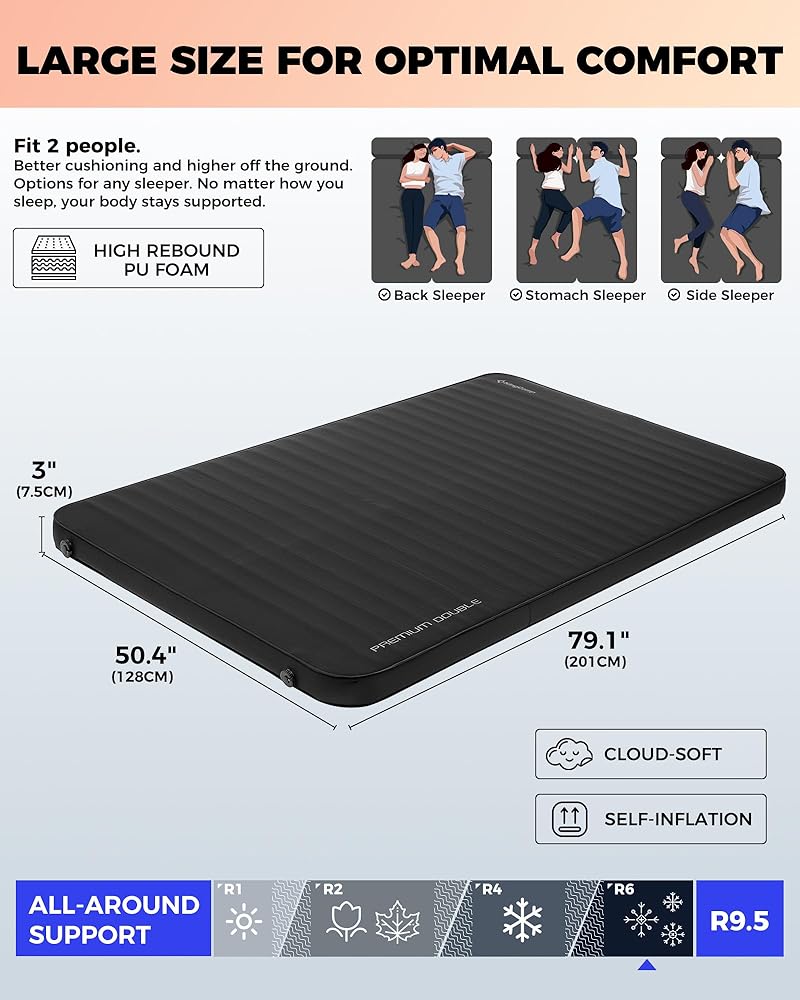 • عزل ممتاز: مرتبة التخييم لشخصين مثالية لجميع المواسم، مما يضمن الدفء في البيئات الباردة، مما يجعلها مثالية للتخييم والمشي لمسافات طويلة والمغامرات الخارجية. مع قيمة R تبلغ 9.5، يمكنك البقاء مرتاحًا حتى في الطقس البارد.