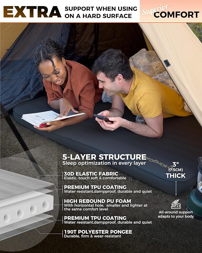 وسادة نوم كينج كامب ذاتية النفخ للتخييم، مرتبة إسفنجية مزدوجة سميكة للغاية ومزدوجة واحدة، سجادة وسادة هوائية للتخييم ذات قيمة عالية، متعددة الألوان والأحجام
