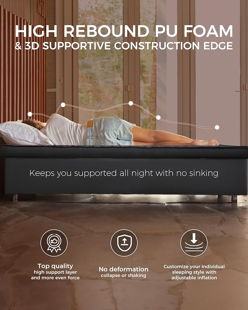 • نفخ سهل وتصميم هادئ: يسمح تصميم الصمام المزدوج لمرتبة الهواء المزدوجة بالنفخ السريع بدون مضخة، مما يضمن نفخًا دقيقًا وتفريغًا سريعًا. بالإضافة إلى ذلك، فهو يقلل من الضوضاء عند الدوران ليلاً، مما يوفر بيئة نوم هادئة لك ولشريكك.
