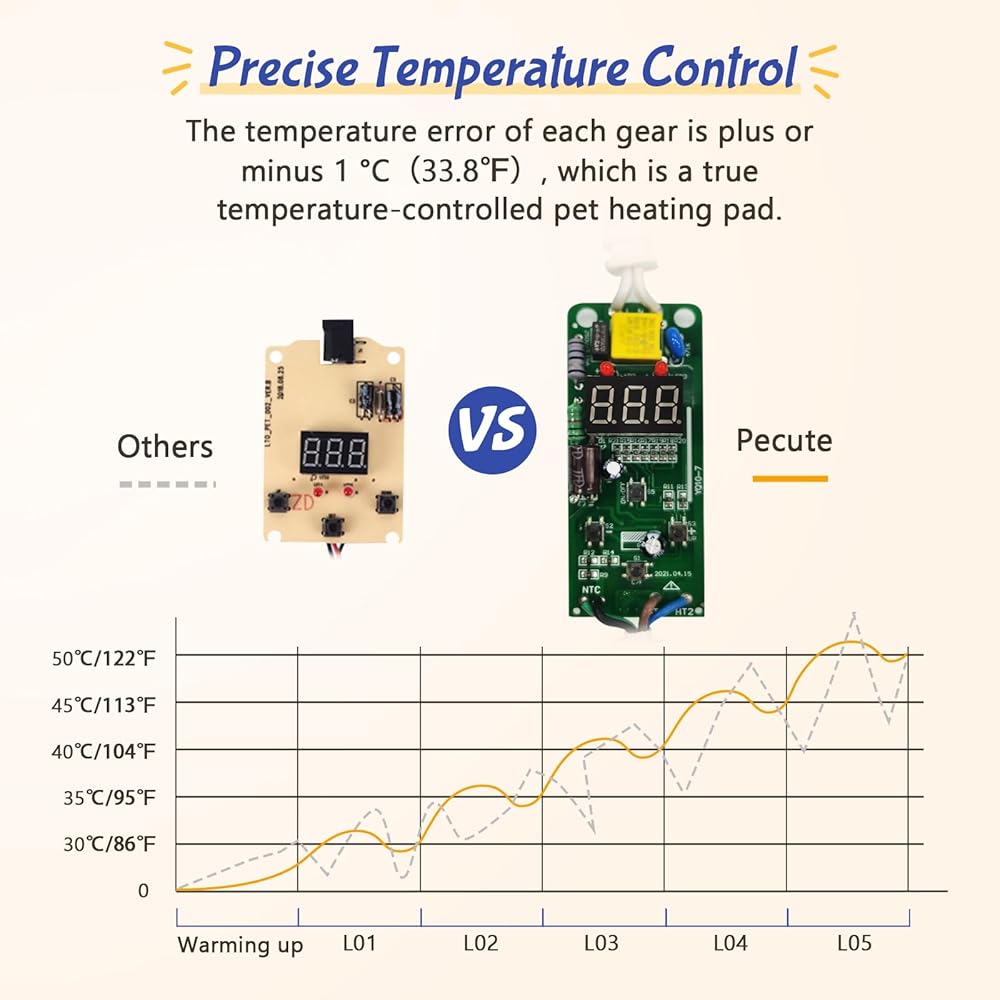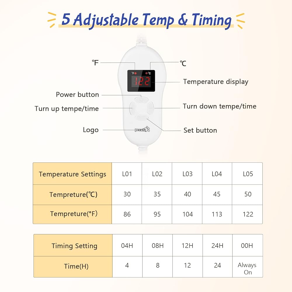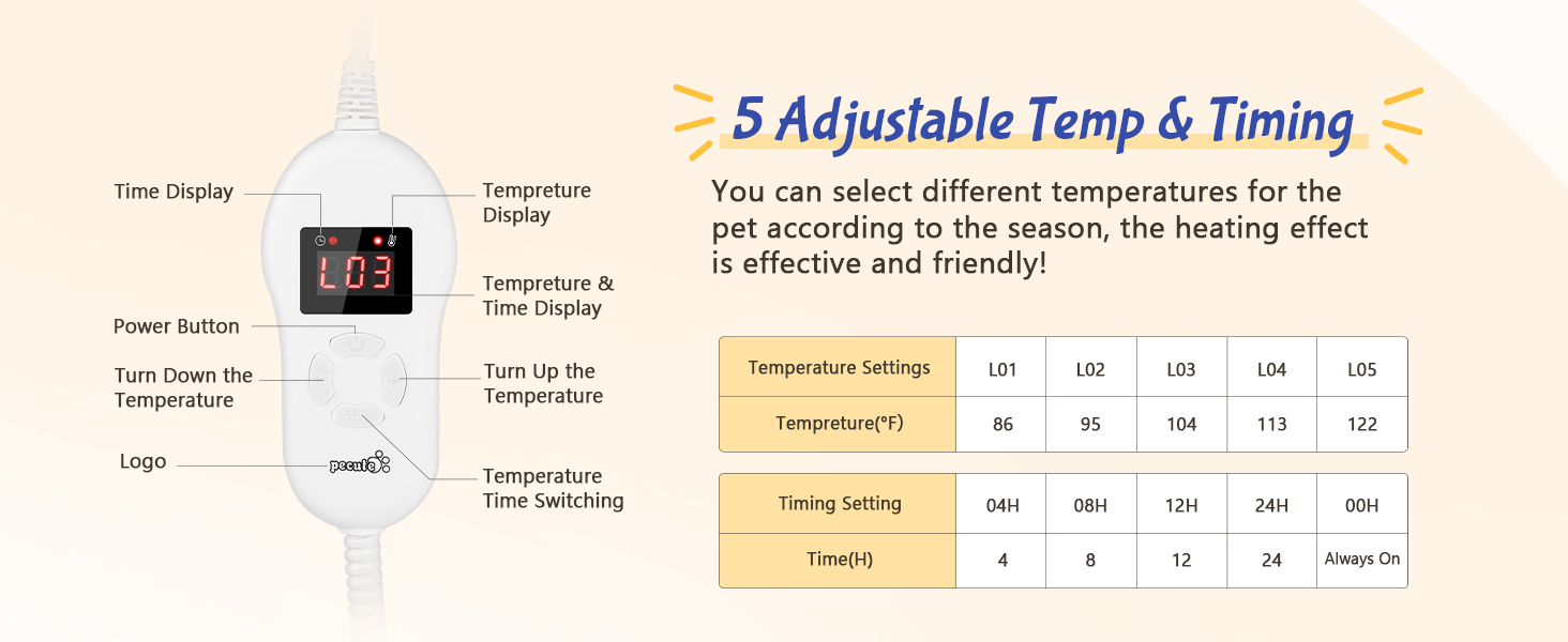 【 درجات حرارة قابلة للتعديل وإعدادات الوقت 】: لتلبية الاحتياجات المتنوعة للحيوانات الأليفة في المواسم والبيئات المختلفة، تأتي وسادة تدفئة الحيوانات الأليفة الخاصة بنا مجهزة بجهاز تحكم في درجة الحرارة. مع 5 مستويات لدرجة الحرارة للاختيار من بينها (86 درجة فهرنهايت/95 درجة فهرنهايت/104 درجة فهرنهايت/113 درجة فهرنهايت/122 درجة فهرنهايت) و4 خيارات توقيت (4 ساعات/8 ساعات/12 ساعة/24 ساعة)، يمكن التحكم بدقة في وسادتنا الساخنة باستخدام مجرد زر واحد، مما يضمن الراحة المثالية لصديقك ذو الفراء.