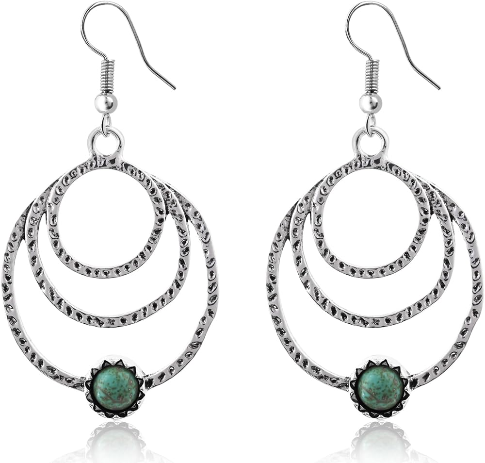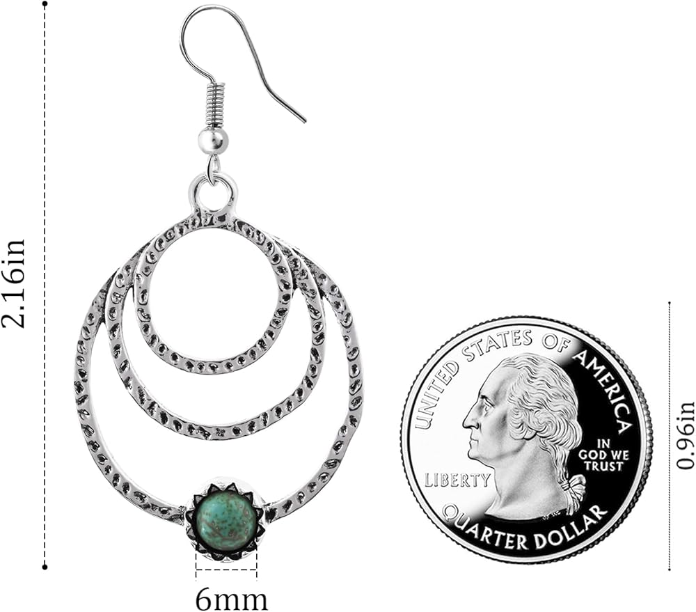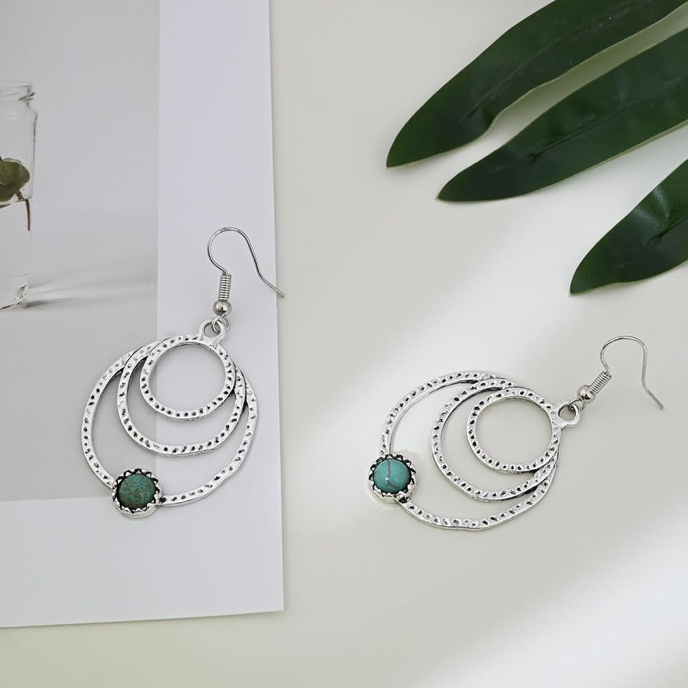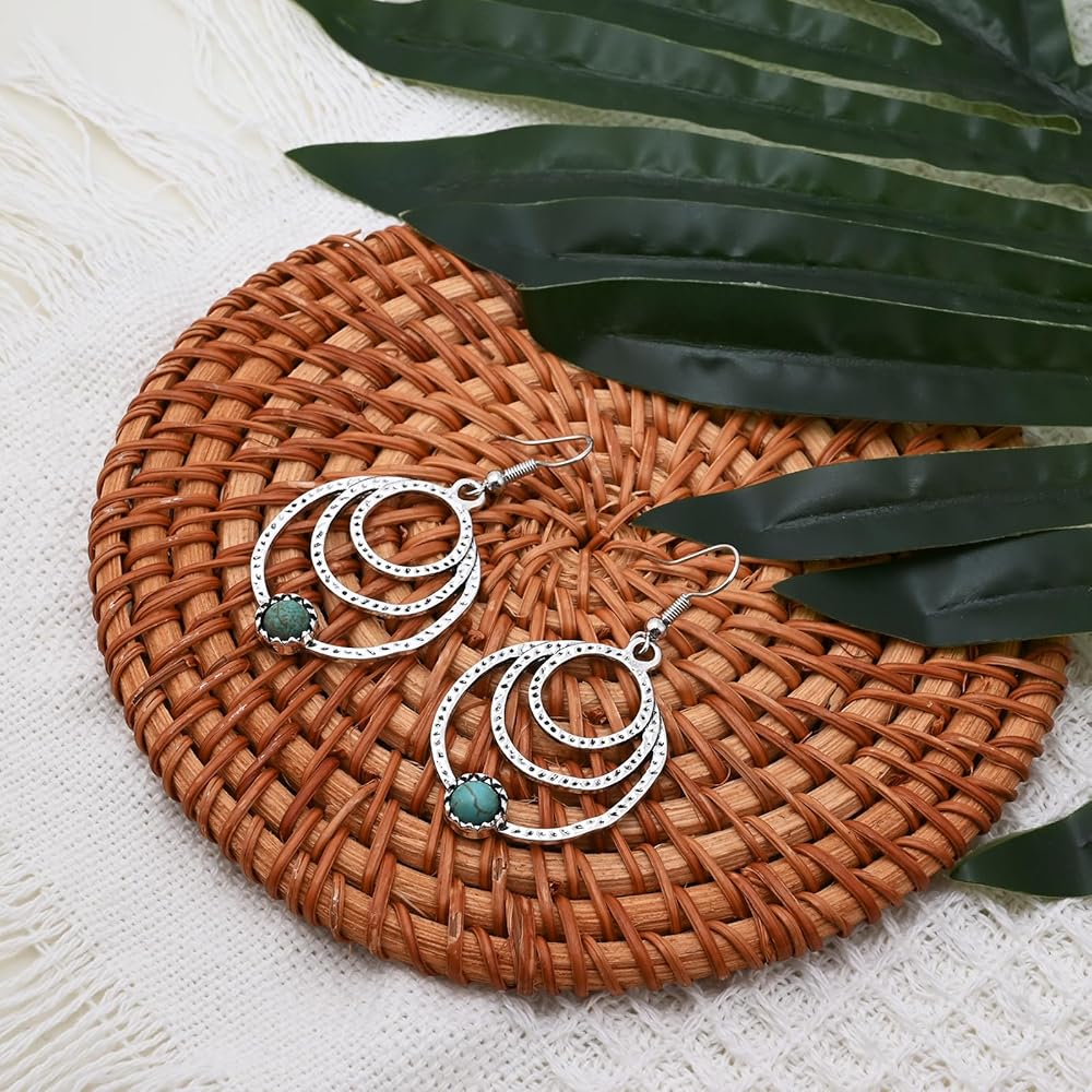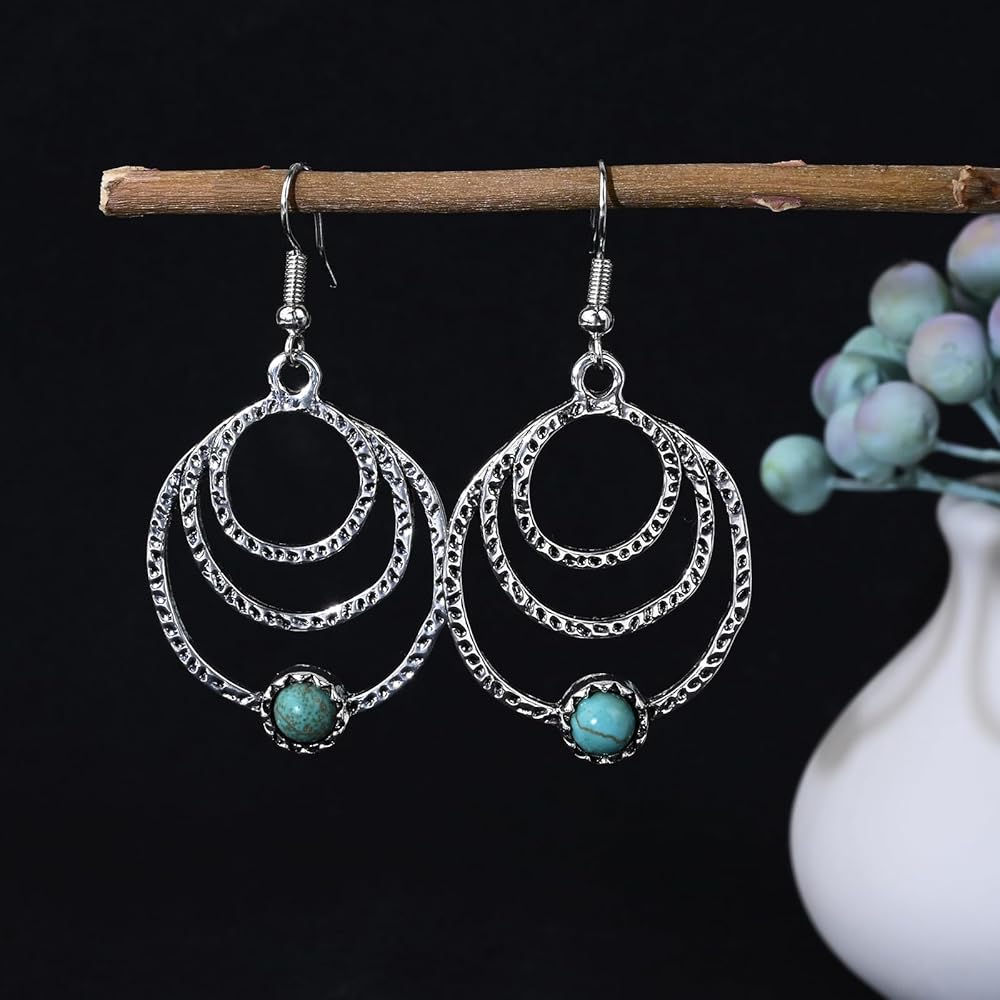 [Boho Earrings] The design inspiration for this pair of turquoise earrings comes from the Bohemian style, with retro embossing and embellished turquoise, and a three ring design, making the entire pair perfect for wearing on vacation!