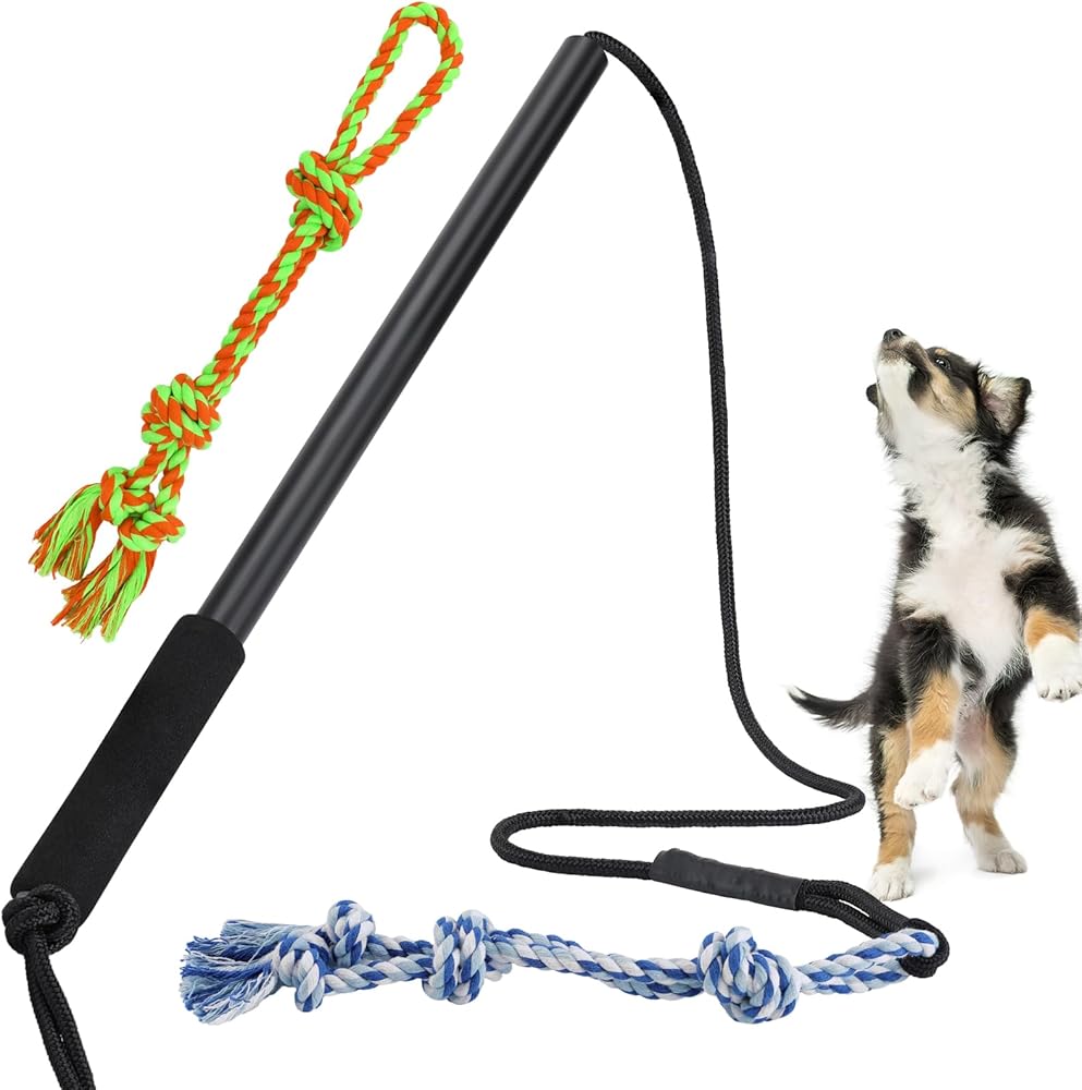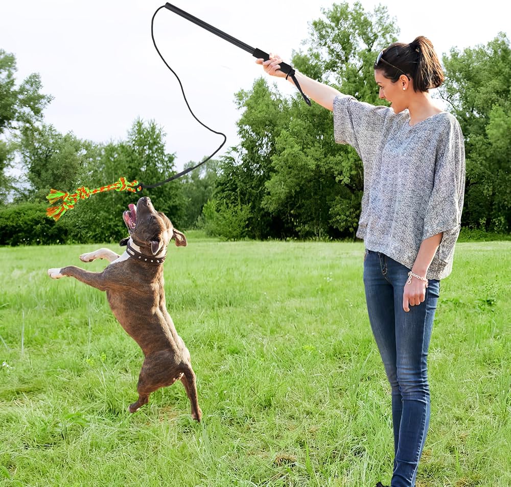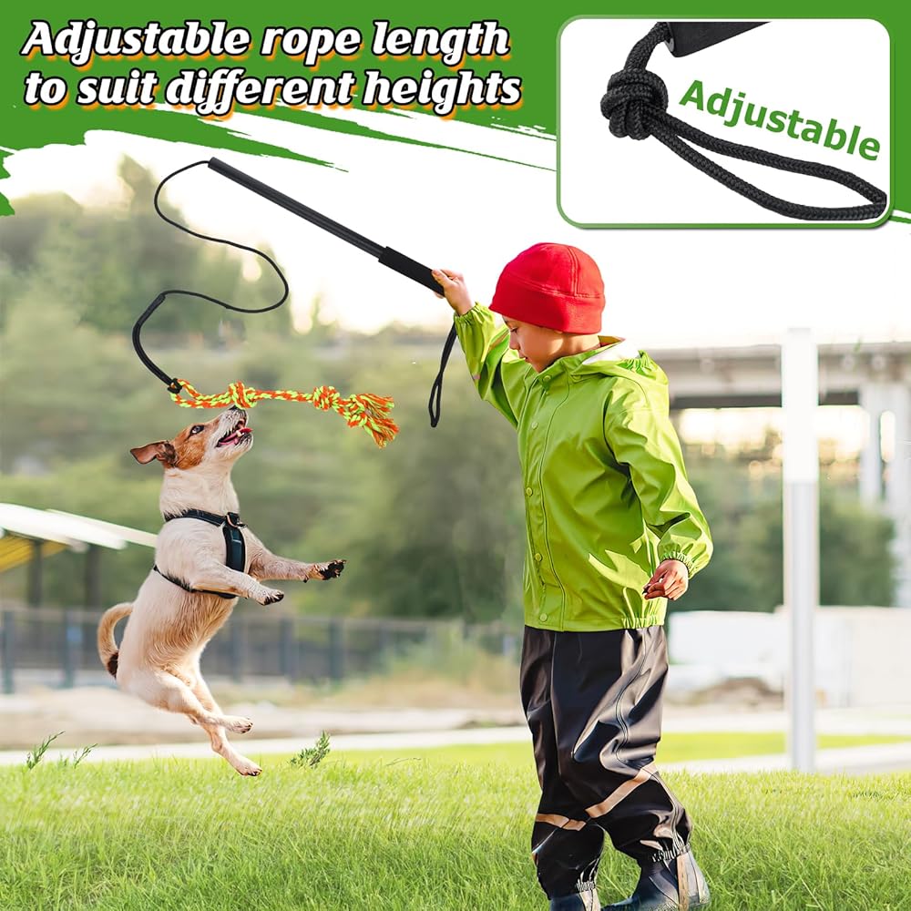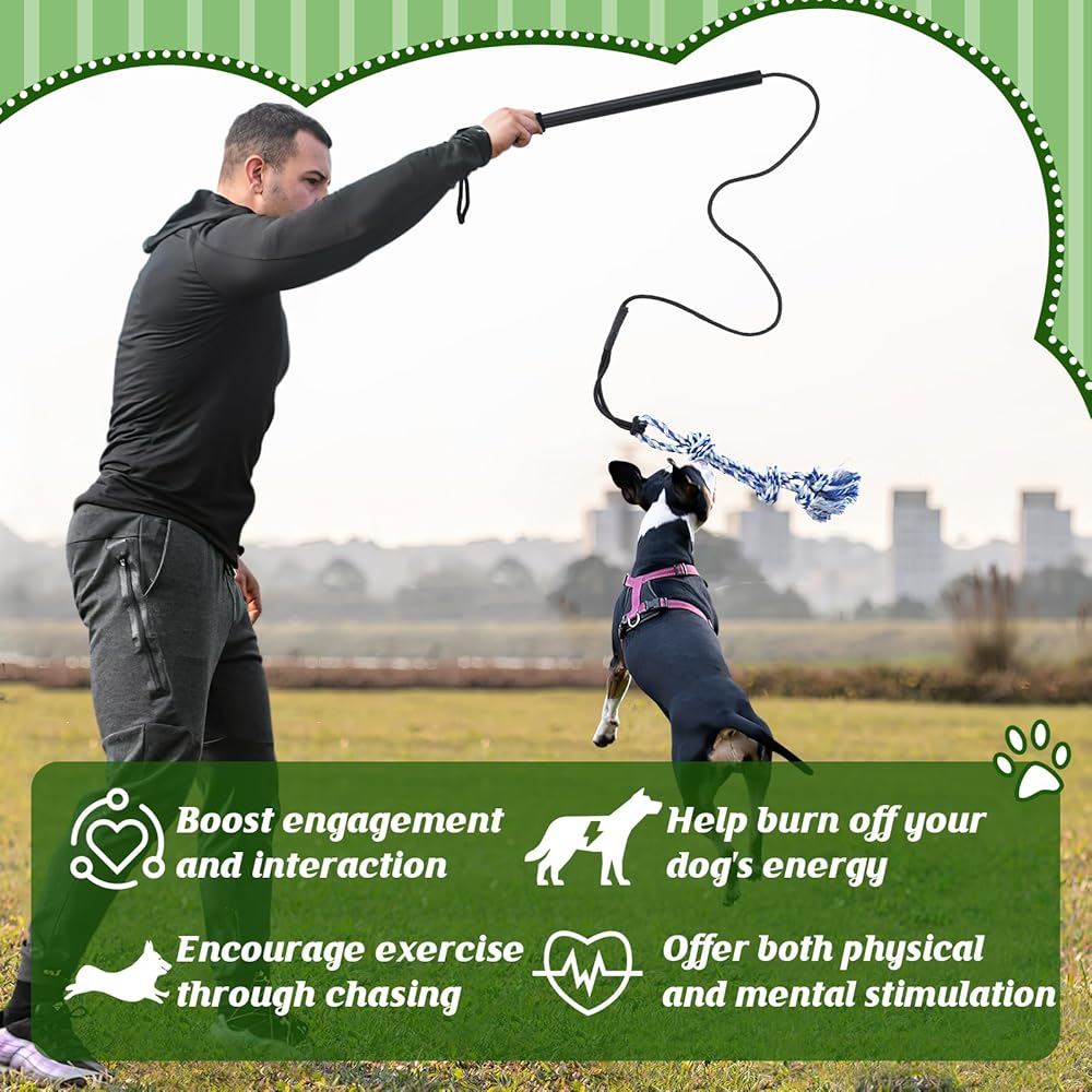 Easy to Store & Carry: This compact flirt pole set includes the pole, rope, and 2 toys, making it easy to store at home or take along for outdoor adventures exercise. Its space-saving design lets you bring interactive fun for your dog anytime, anywhere.