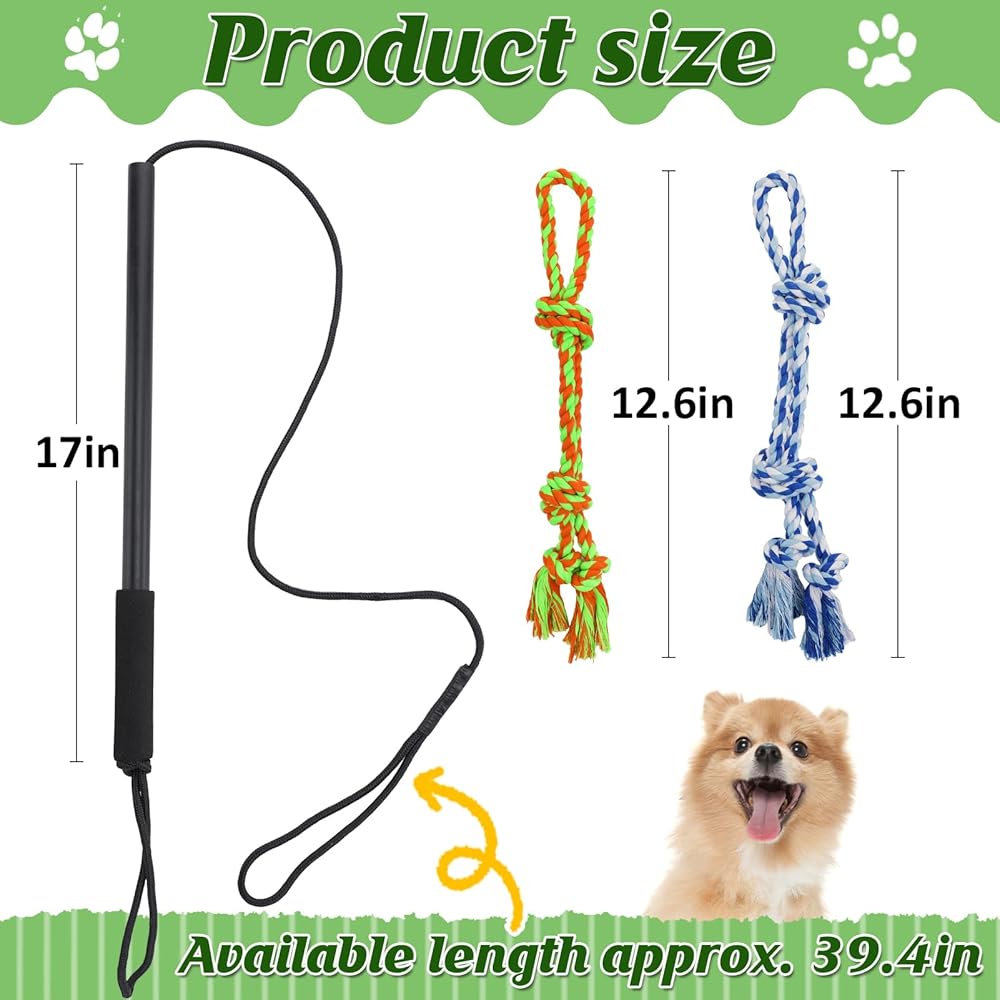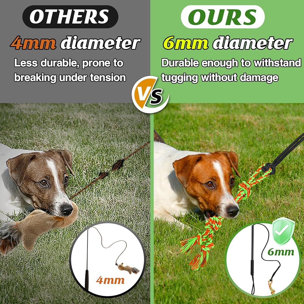 Strong & Durable: With durable 0.24'' diameter rope, the dog flirt pole toy withstands strong tugs and pulls without fraying. The ergonomic handle ensures a firm grip, preventing slips. It also includes 2 brightly colored cotton toys to catch your dog's attention and enhance their playtime experience.