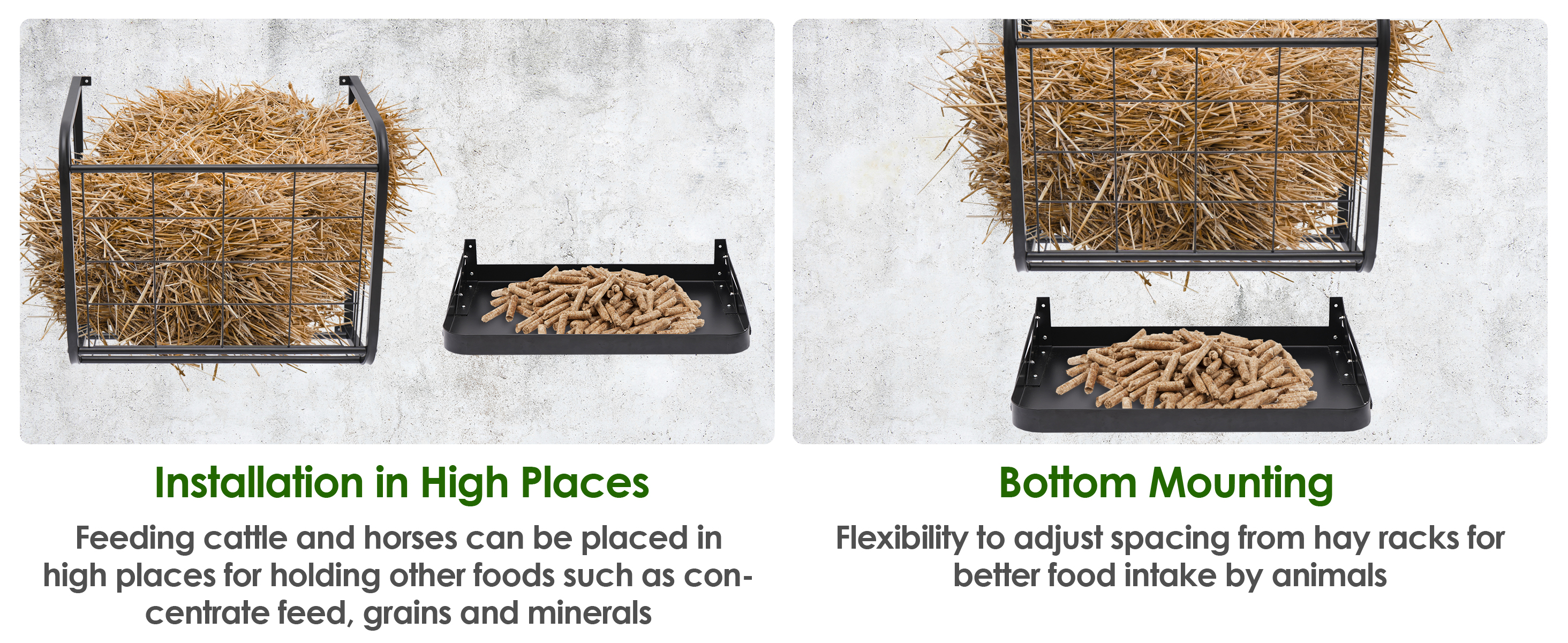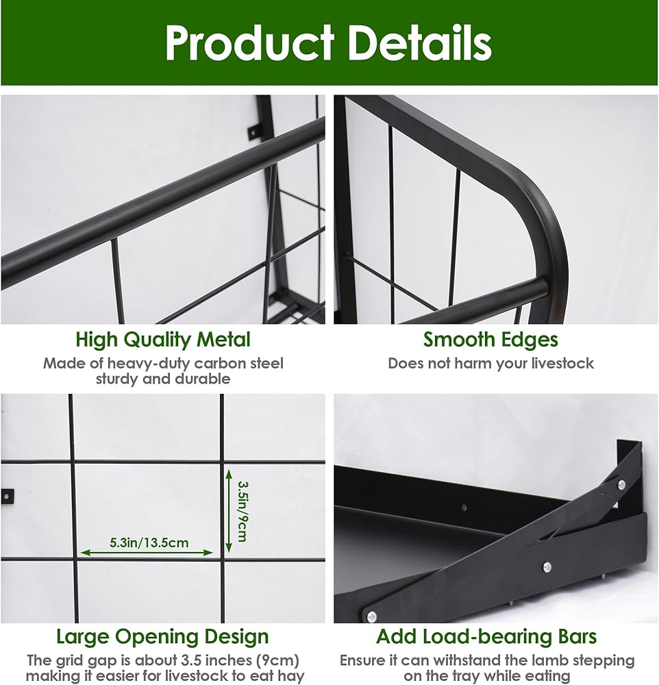 • 【معدن متين】 رف القش مصنوع من فولاذ كربوني عالي التحمل، هيكل معدني عالي الجودة، قوي ومتين لسنوات من الاستخدام. الحواف الناعمة لن تؤذي الماشية الخاصة بك