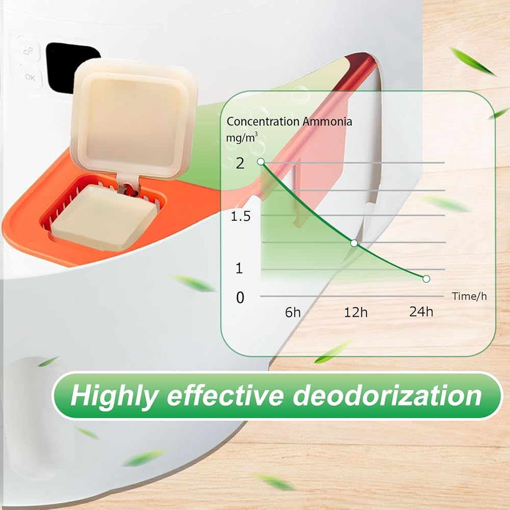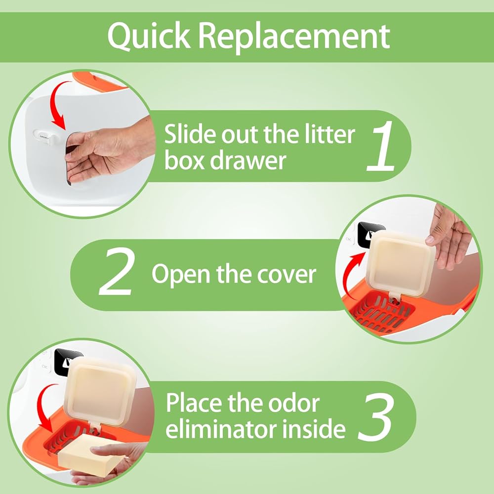 Easy to Replace: Replacing the odor eliminator is a breeze! Simply pull open the drawer of your automatic cat litter box, insert the eliminator, and you're done. This effortless process saves time and energy, helping you maintain the freshness of the litter box with minimal effort.