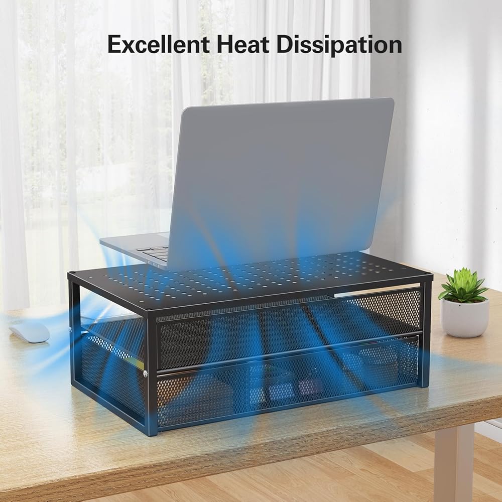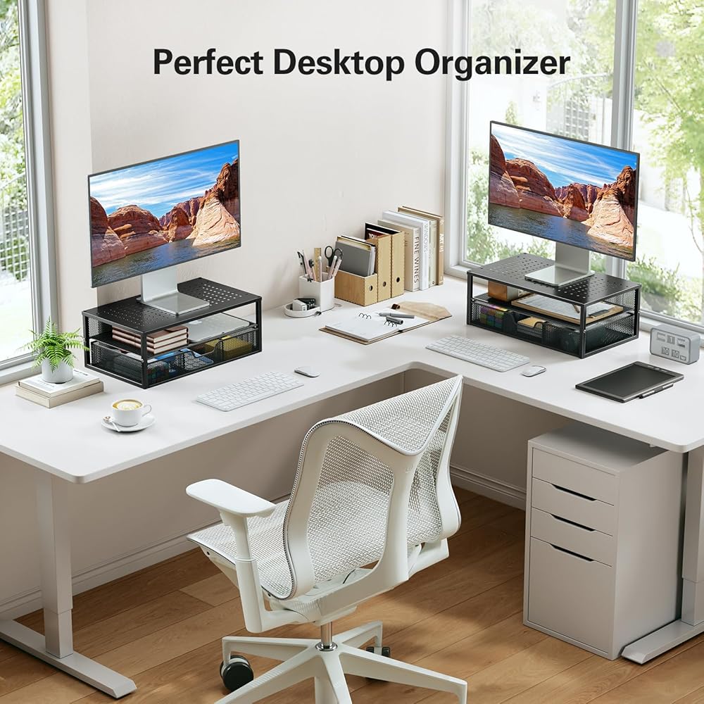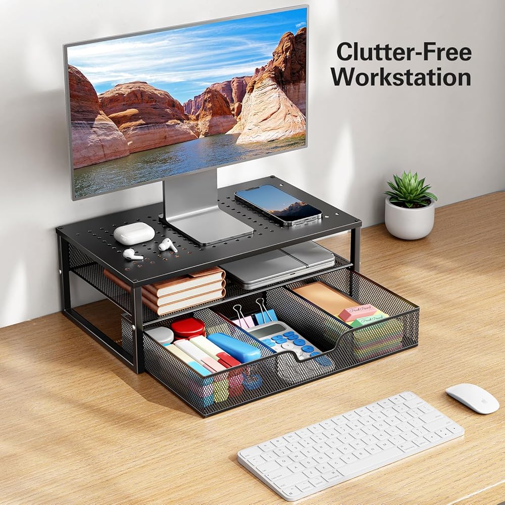 تنظيم أفضل لمساحة العمل: يتميز حامل الشاشة هذا بتصميم من طبقتين ودرج منزلق لتوفير مساحة تخزين واسعة. توفر الأرفف مكانًا لتخزين شاشتك وجهاز الكمبيوتر المحمول الخاص بك، بينما يعد الدرج المكون من 3 حجرات مثاليًا للوازم المكتبية والملحقات بما في ذلك الأقلام والملاحظات اللاصقة والأجهزة الصغيرة.