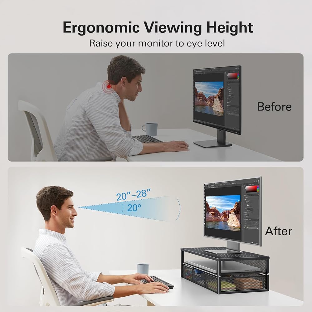 ترقية مريحة: تعمل المنصة العلوية لحامل الشاشة على رفع شاشتك بمقدار 6.1 بوصة أقرب إلى مستوى العين، مما يحول مكتبك على الفور إلى مساحة عمل أكثر راحة. بالمقارنة مع وضع شاشتك مباشرة على المكتب، يساعد حامل الشاشة هذا على تجنب إجهاد الرقبة والعين للحصول على وضعية أفضل.