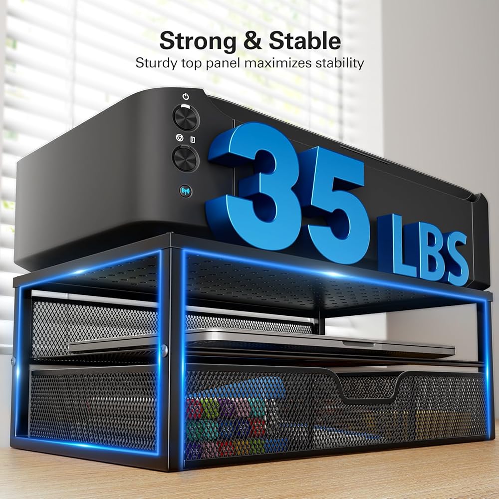 هيكل معدني متين بالكامل: تم تصميم منظم المكتب هذا لتحقيق ثبات استثنائي واستخدام طويل الأمد. يمكن للمنصة العلوية القوية أن تدعم ما يصل إلى 35 رطلاً لحمل الشاشة أو الكمبيوتر المحمول أو الطابعة بشكل آمن، مما يضمن راحة البال لمعدات مكتبك.