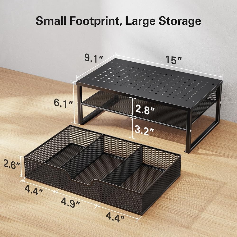 منظم مكتب متعدد الأغراض: يمكن استخدام هذا الحامل (أبعاد الحامل: 15 بوصة عرض × 9.1 بوصة عمق × 6.1 بوصة ارتفاع) كحامل شاشة أو حامل كمبيوتر محمول أو حامل طابعة أو منظم ملفات، مما يجعله إضافة متعددة الاستخدامات لمساحة العمل الخاصة بك. يمكن أيضًا استخدام الدرج المكون من 3 حجرات القابل للإزالة لتنظيم اللوازم المكتبية بشكل منفصل.