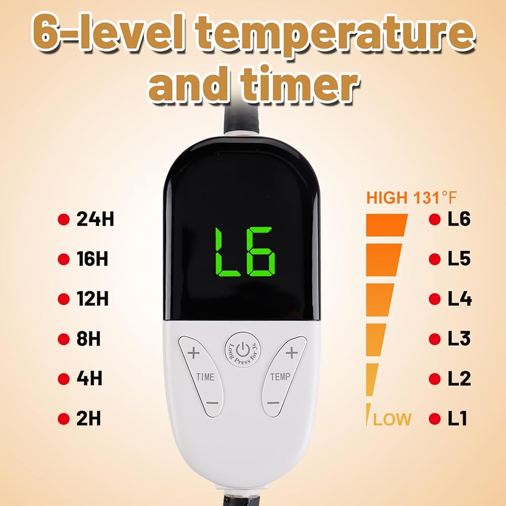درجة حرارة ومؤقت متعدد المستويات: يتميز بـ 6 إعدادات لدرجة الحرارة، كل منها يزيد بمقدار 37.4 درجة فهرنهايت، ويمكن أن يصل إلى 131 درجة فهرنهايت. تسمح إعدادات المؤقت الـ 6 (2 ساعة، 4 ساعات، 8 ساعات، 12 ساعة، 16 ساعة، و24 ساعة) بالتحكم المرن في وقت التسخين، وهو مريح وموفر للطاقة.